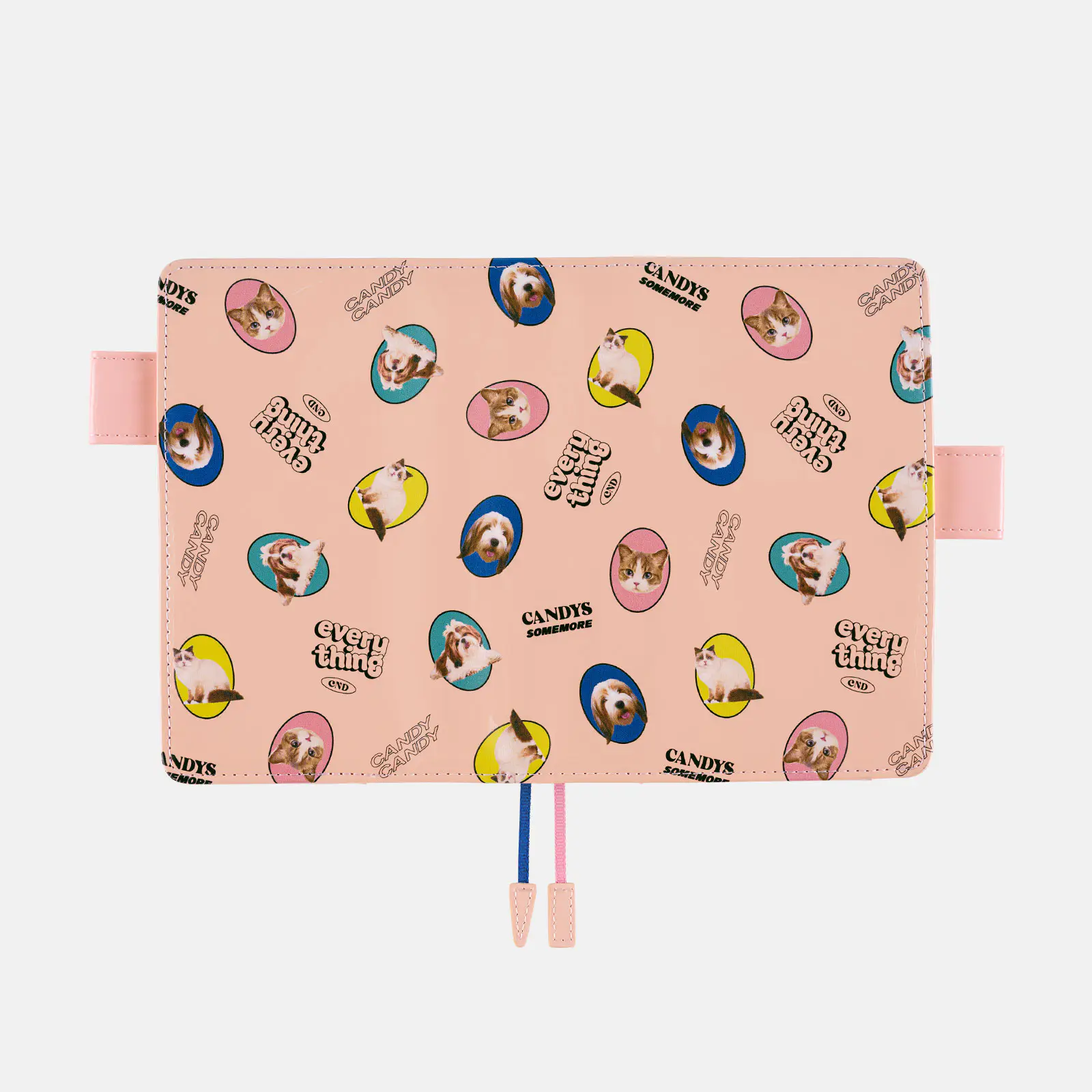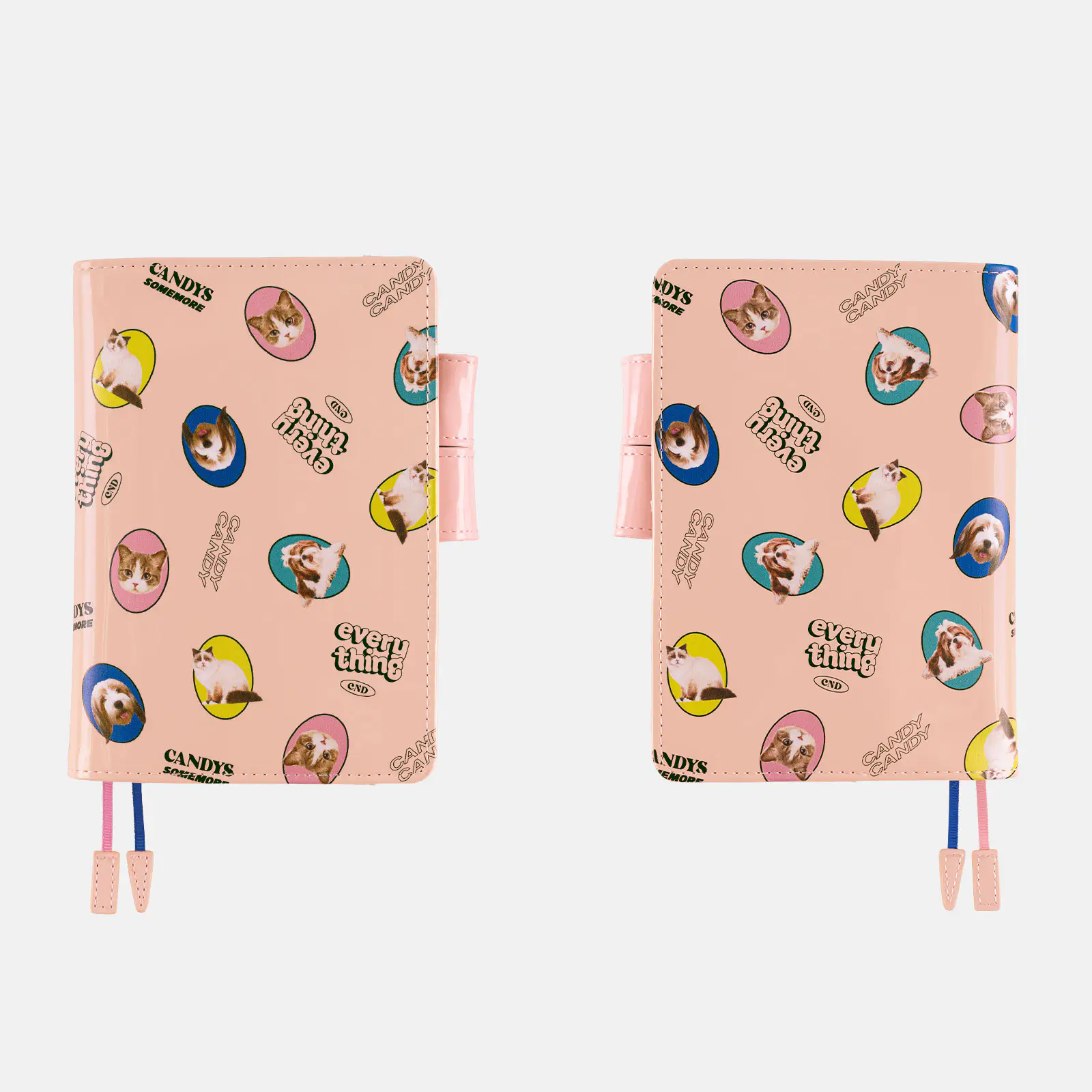 光沢のあるエナメル素材に犬と猫の写真をちりばめた、