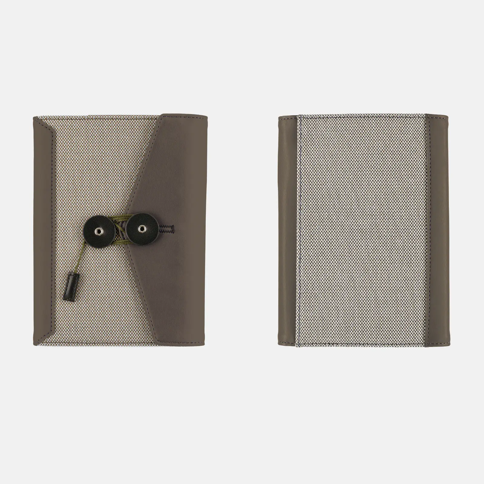 三角のフラップと、質感のちがう2つの生地を使った