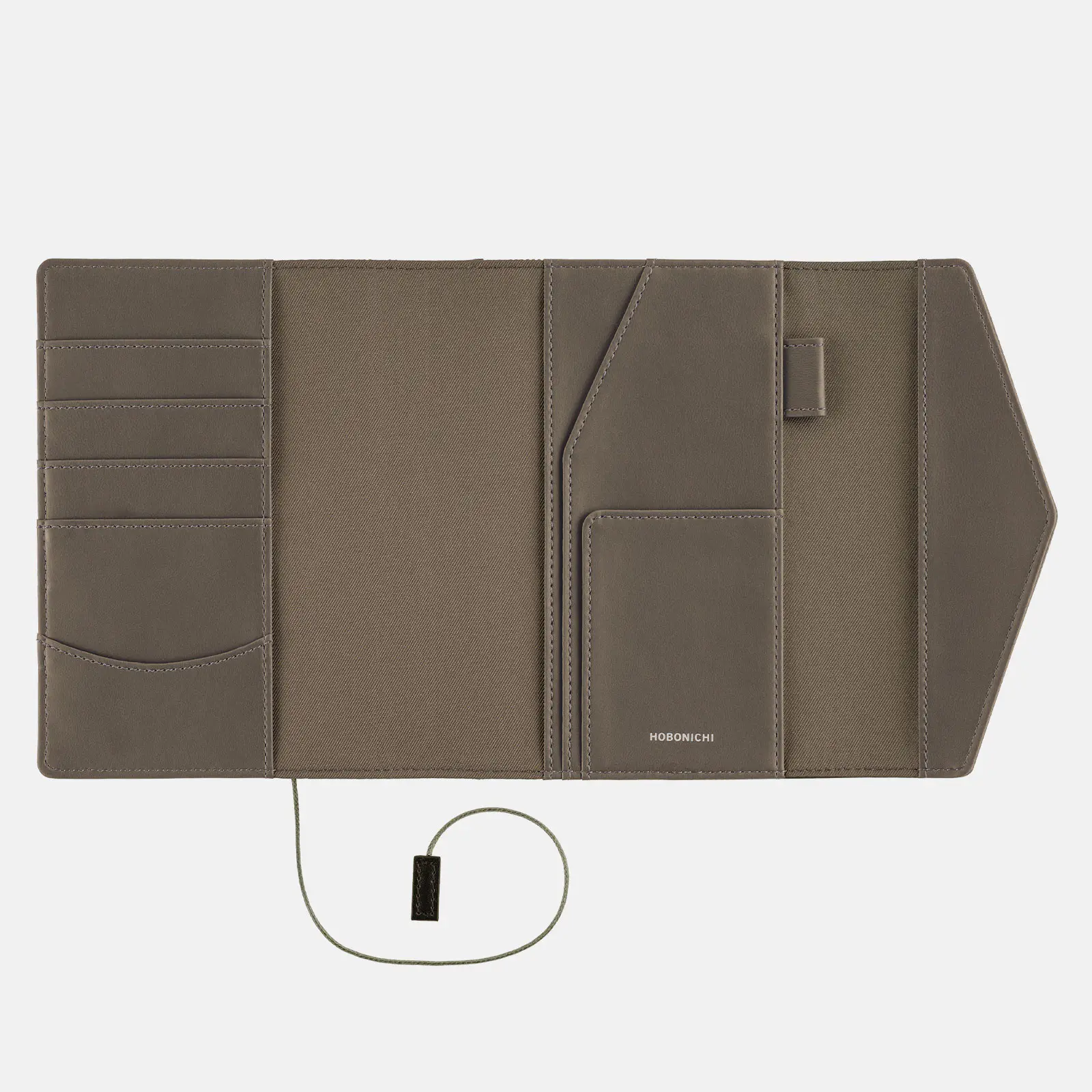 紐は深いカーキ色。シンプルにそのまま巻いても、