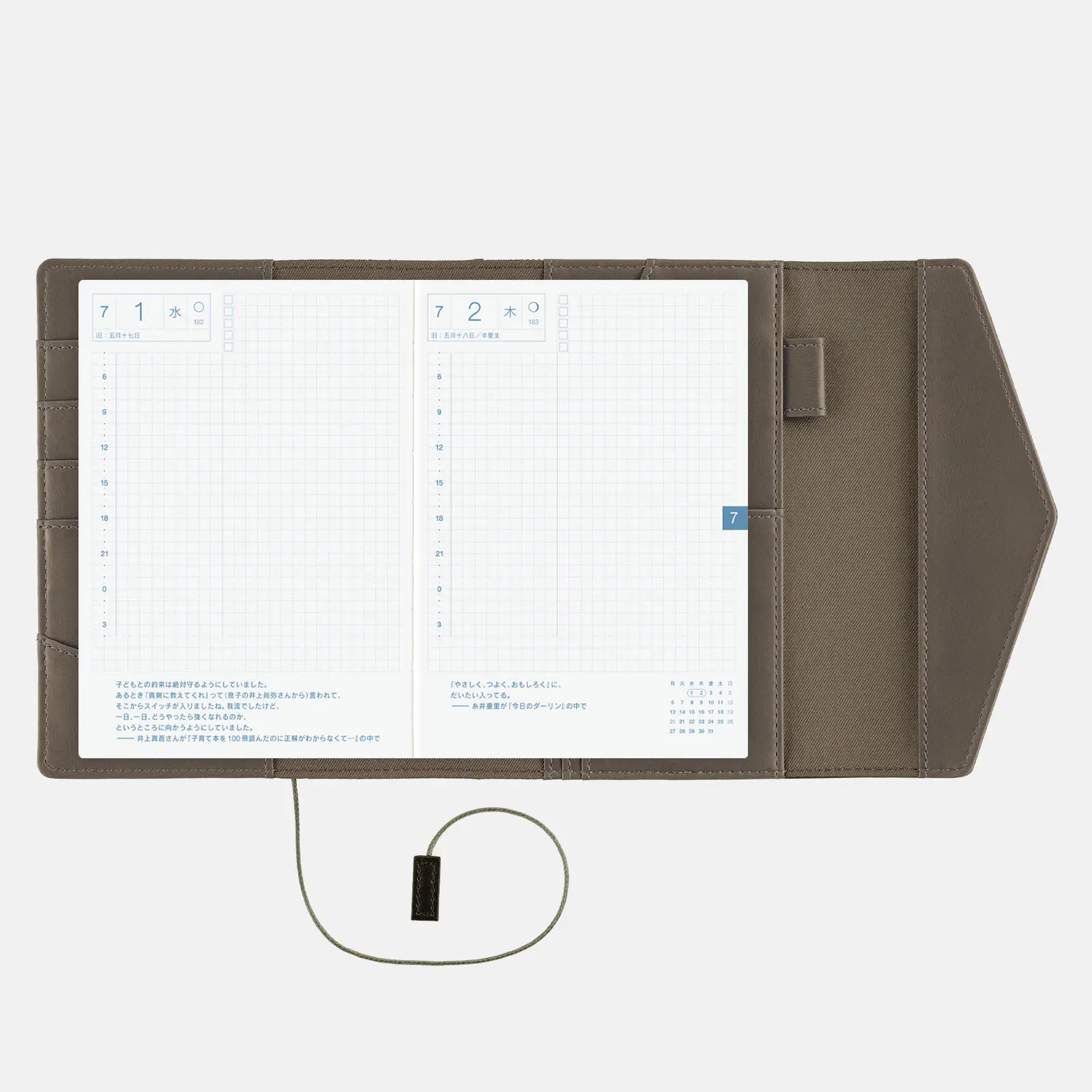 | 記載される内容 | 日番号/週番号(月間カレンダーと1日ページに記載)/月の満ち欠け(1日ページ全ページに記載・月間カレンダーに満月と新月のみ記載) |
