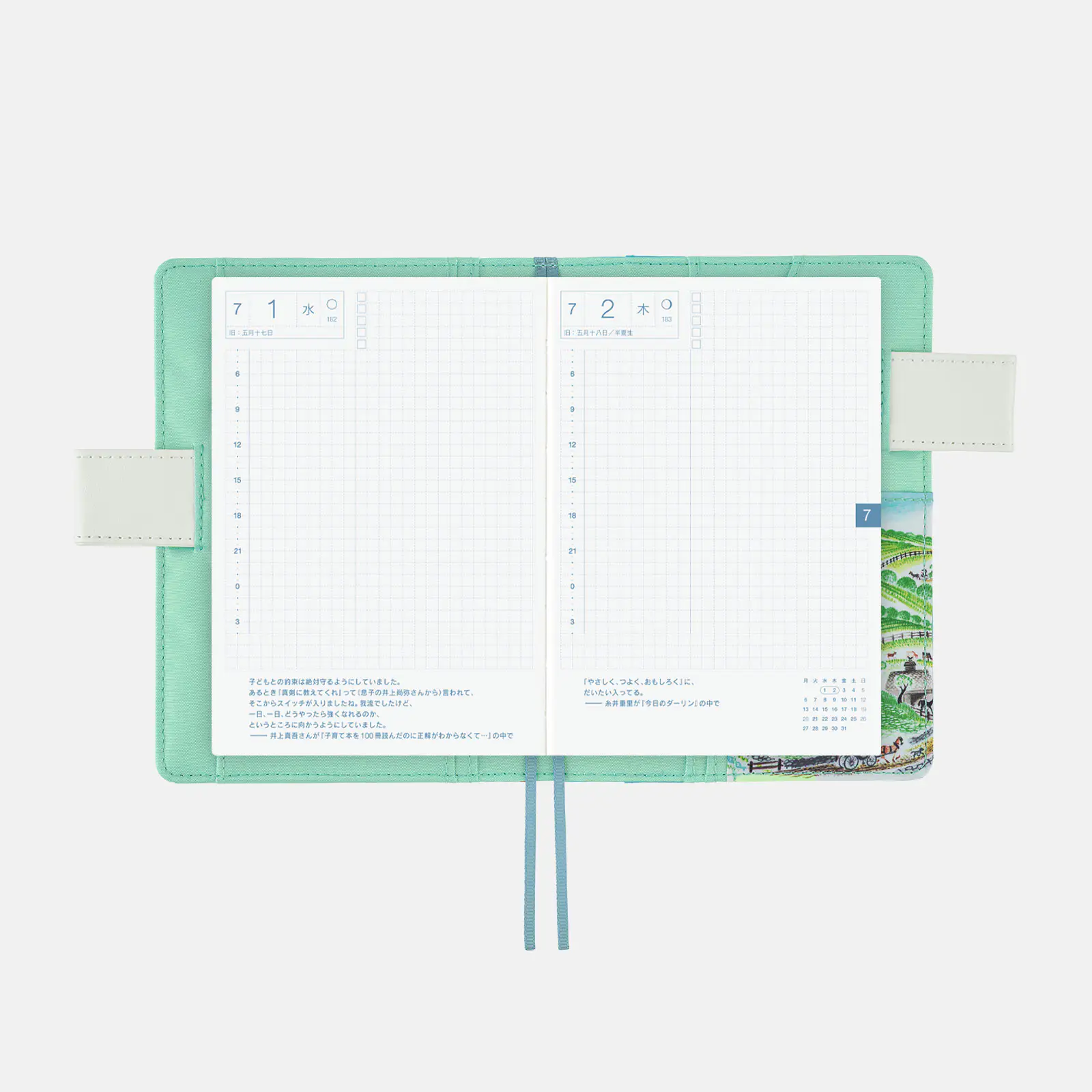 | 記載される内容 | 日番号/週番号(月間カレンダーと1日ページに記載)/月の満ち欠け(1日ページ全ページに記載・月間カレンダーに満月と新月のみ記載) |
