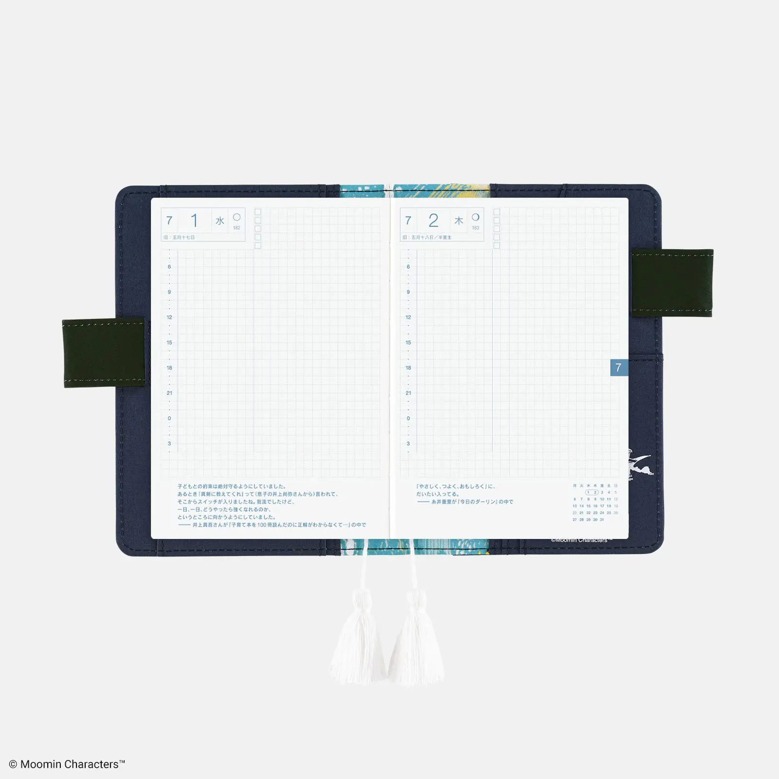 記載される内容日番号/週番号(月間カレンダーに記載)/月の満ち欠け(1日ページ全ページに記載、月間カレンダーに満月と新月のみ記載)