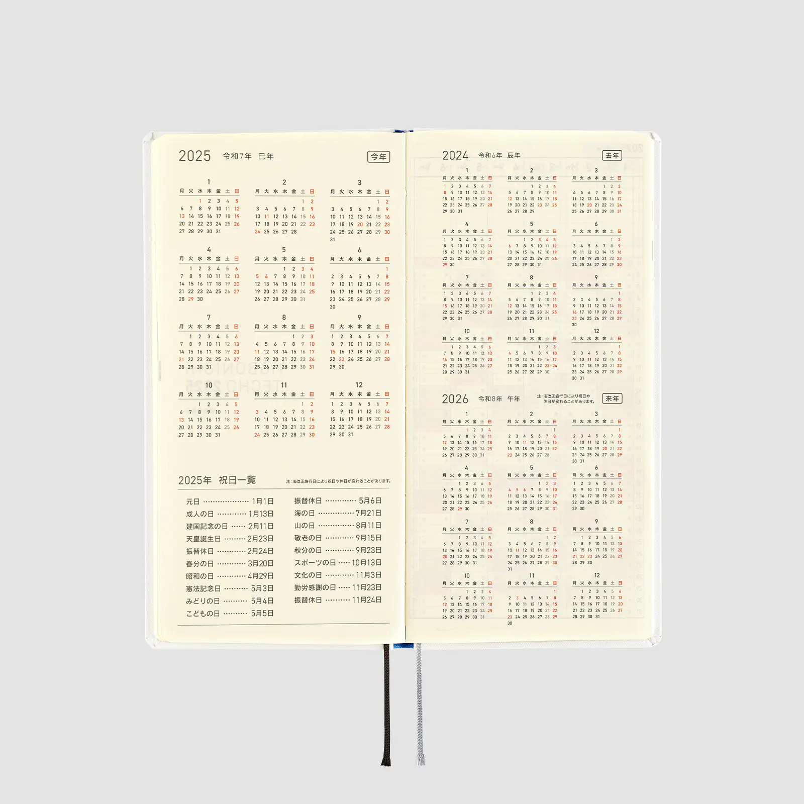 記載される内容週番号/六曜(大安、仏滅など)/二十四節気(立春、春分、夏至など)/祝日、記念日など(バレンタインデー、ひなまつり、母の日、父の日など)/月の満ち欠け(週間ページ全てに記載・月間カレンダーに満月と新月のみ記載)