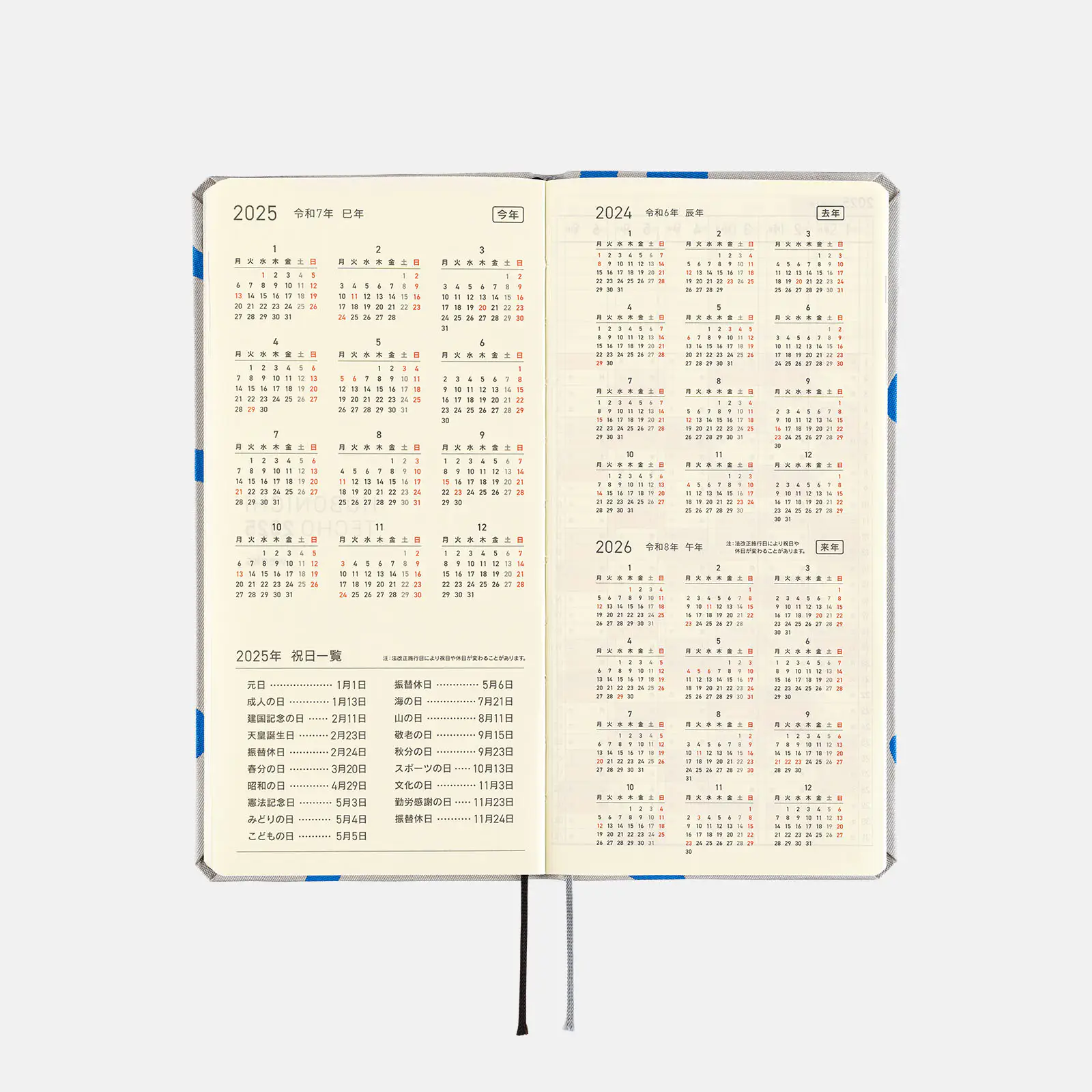 | 記載される内容 | 週番号/六曜(大安、仏滅など)/二十四節気(立春、春分、夏至など)/祝日、記念日など(バレンタインデー、ひなまつり、母の日、父の日など)/月の満ち欠け(週間ページ全てに記載・月間カレンダーに満月と新月のみ記載) |