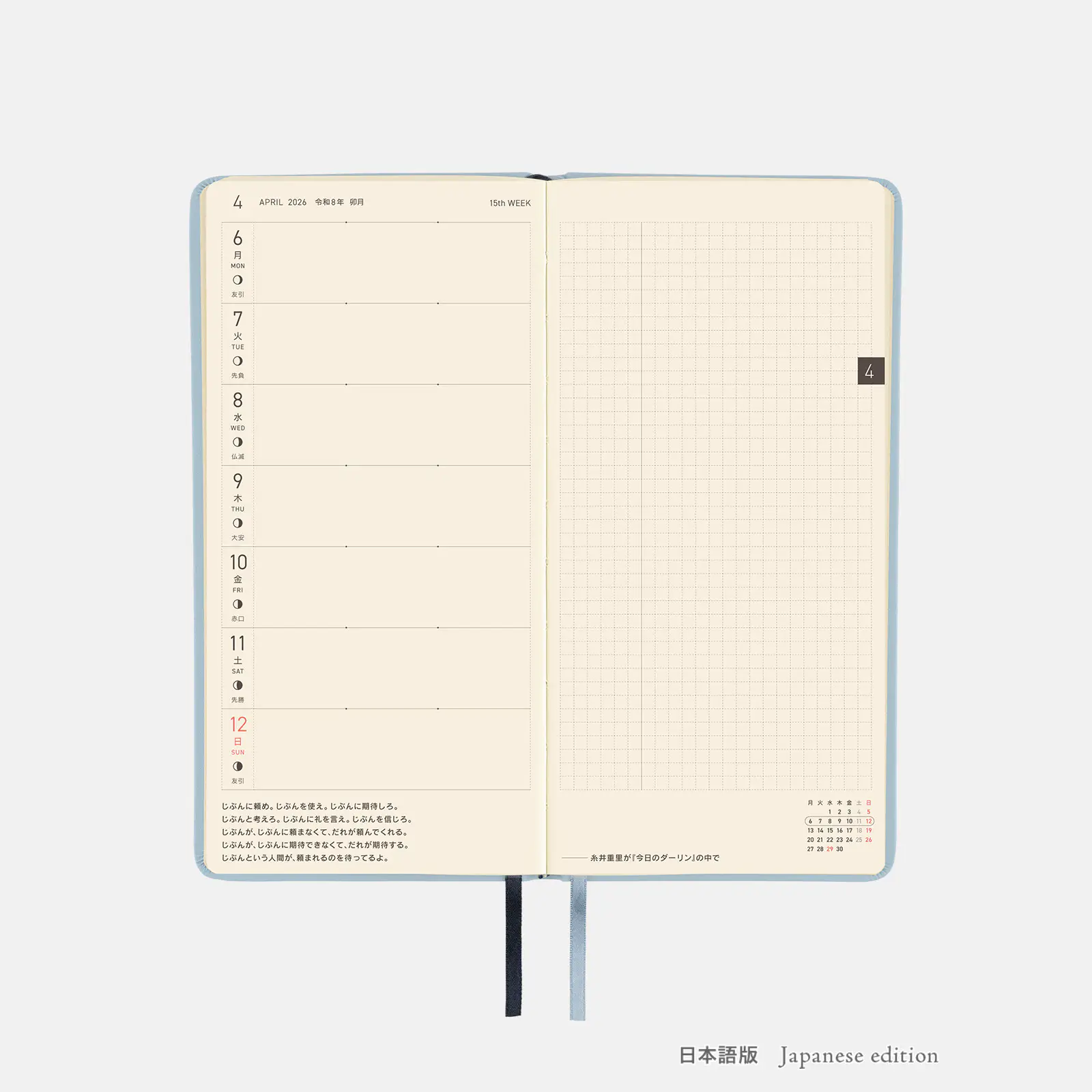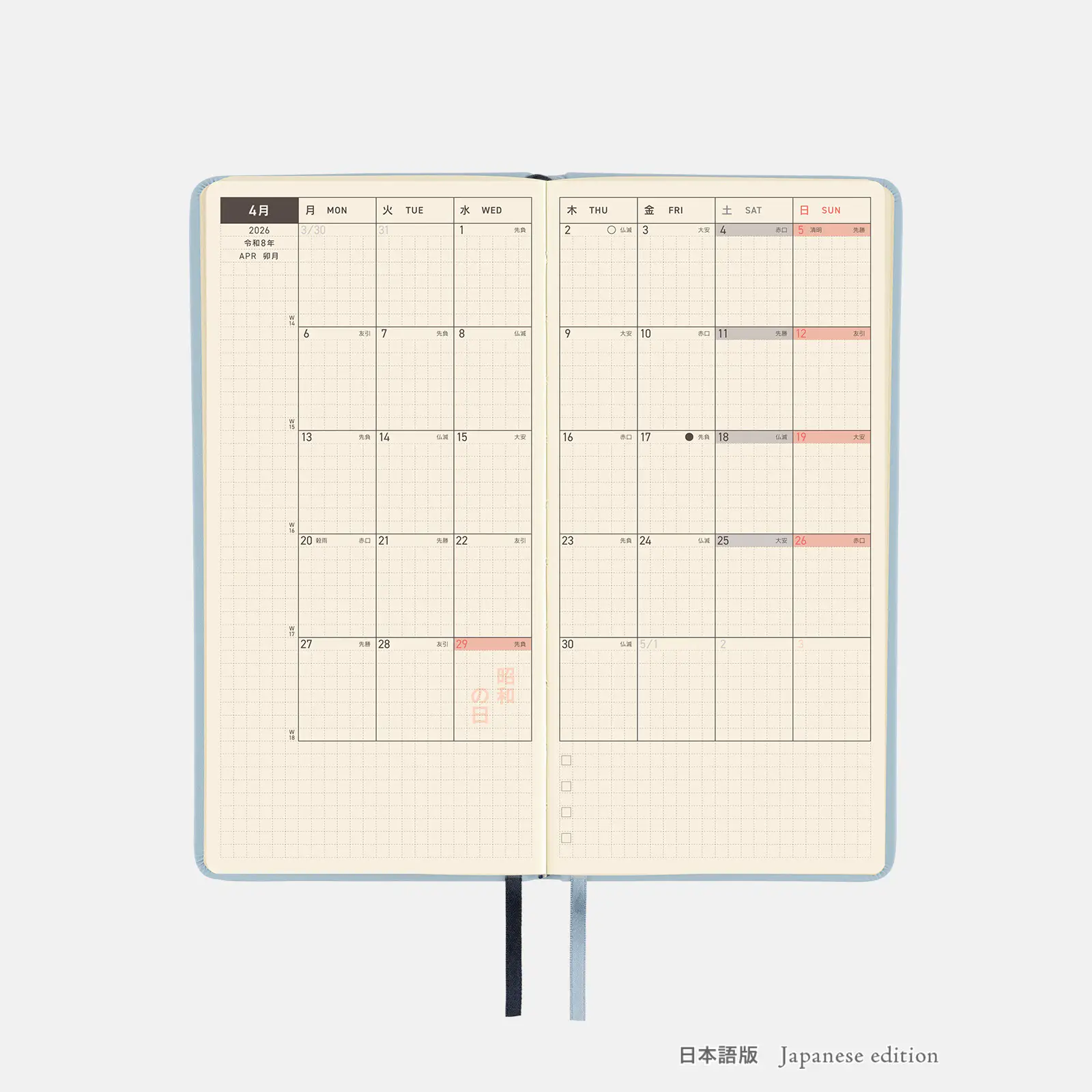 記載される内容週番号/六曜(大安、仏滅など)/二十四節気(立春、春分、夏至など)/祝日、記念日など(聖バレンタインデー、ひな祭り、母の日、父の日など)/月の満ち欠け(週間ページ全てに記載・月間カレンダーに満月と新月のみ記載)