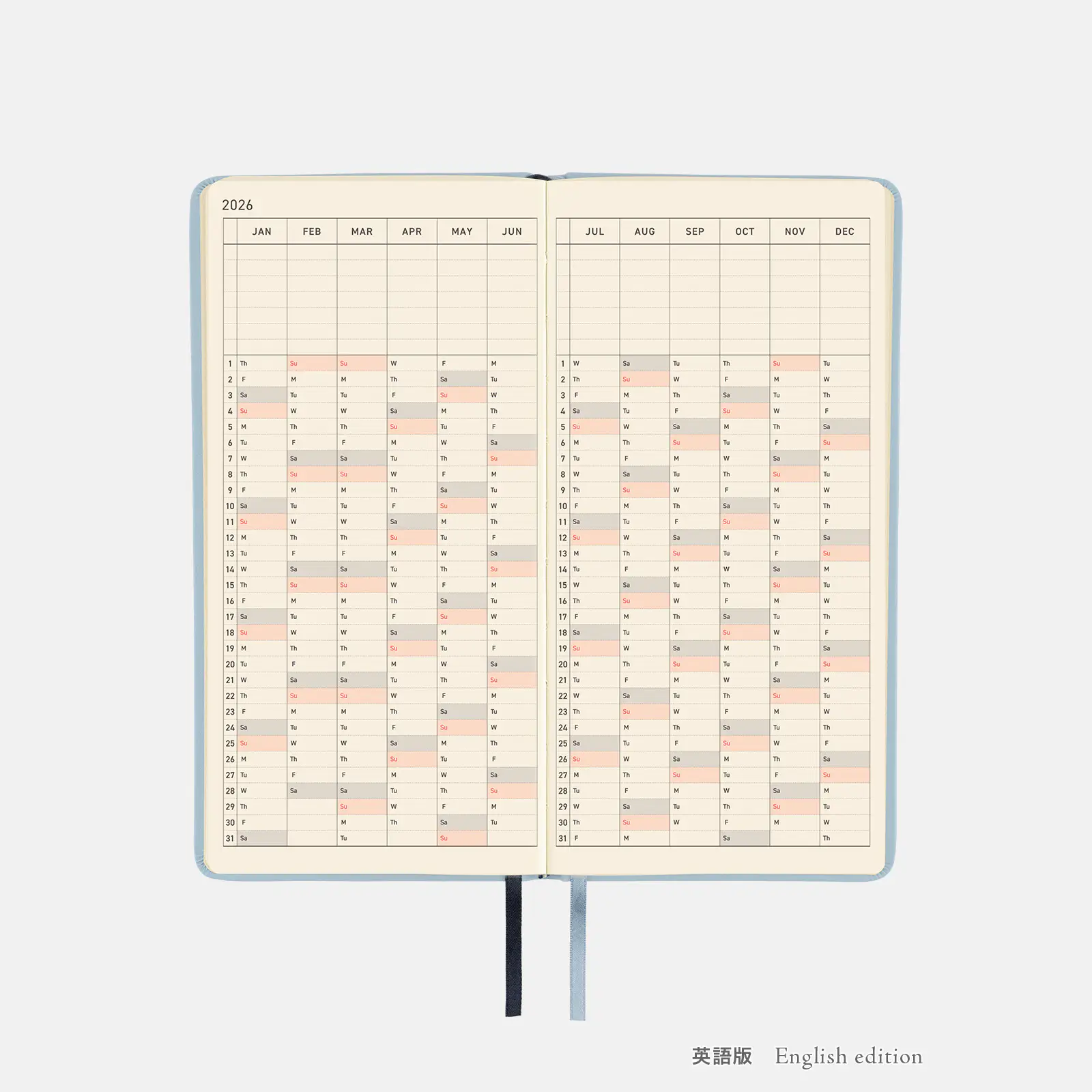 表紙の「2026」の箔押しはマットなシルバーで、
