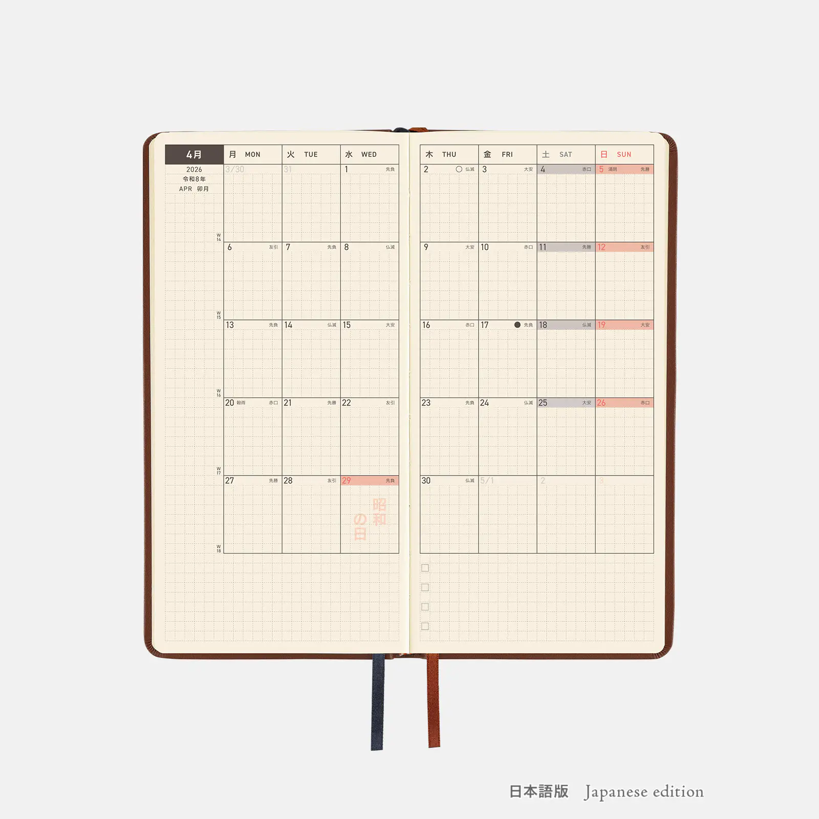 記載される内容週番号/六曜(大安、仏滅など)/二十四節気(立春、春分、夏至など)/祝日、記念日など(聖バレンタインデー、ひな祭り、母の日、父の日など)/月の満ち欠け(週間ページ全てに記載・月間カレンダーに満月と新月のみ記載)