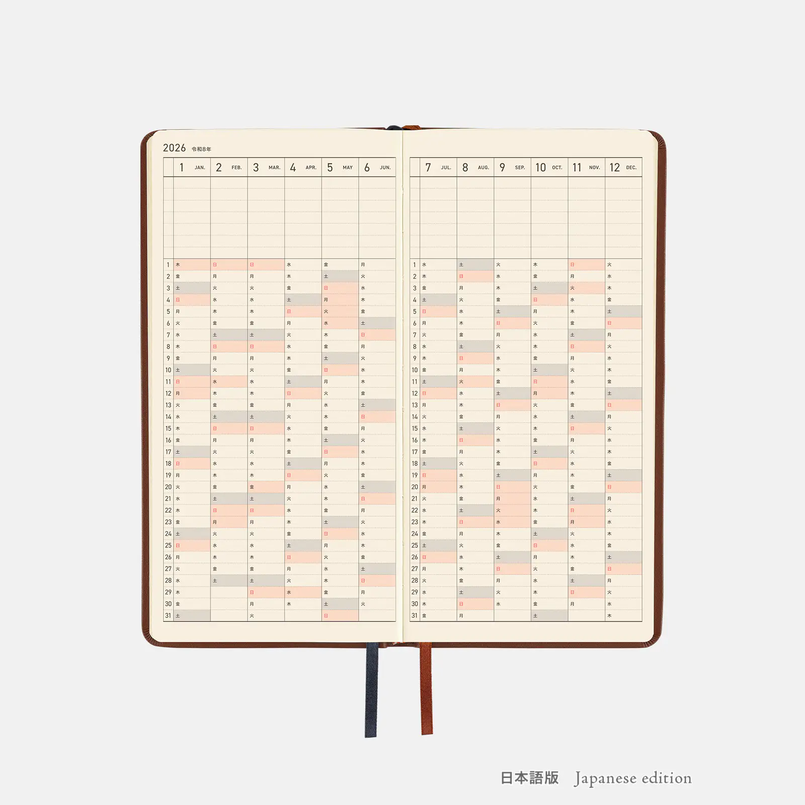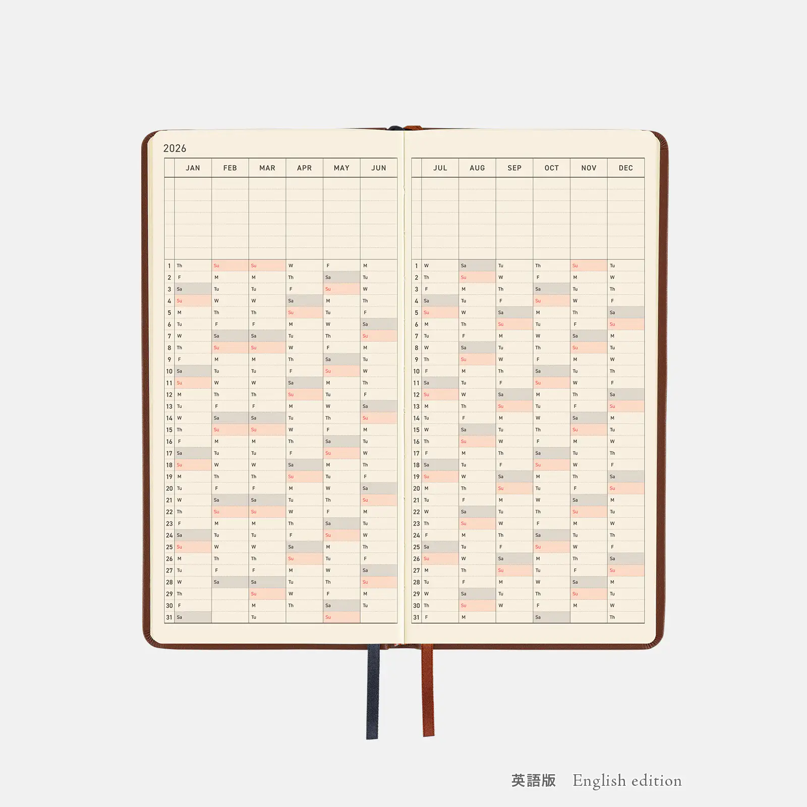 表紙の「2026」の箔押しはマットなゴールドで