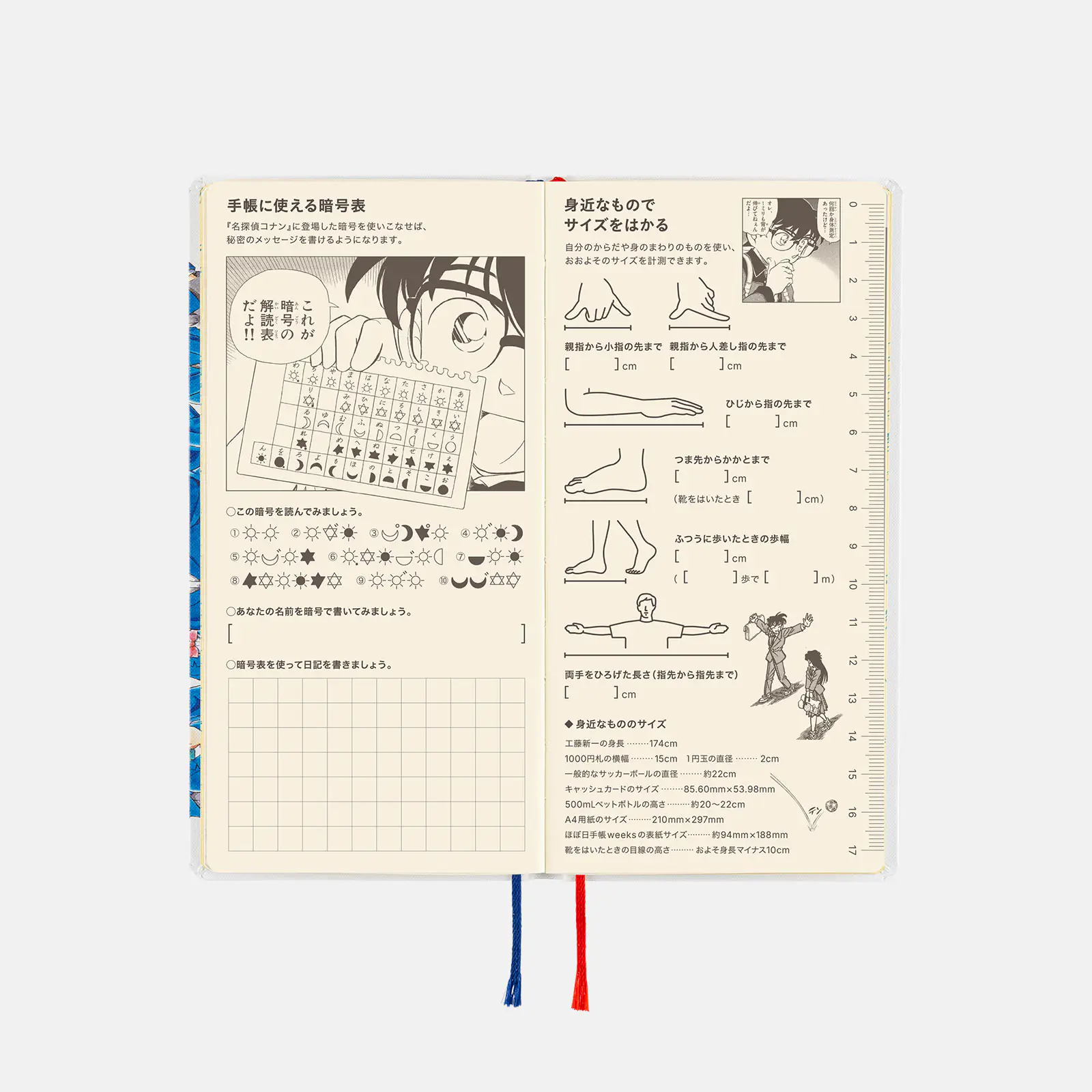 | おまけページ | 365のチェックシート/手帳に使える暗号表/身近なものでサイズをはかる/My 100/あれれ~?/欲望の標的(ターゲット)/四季折々の物語(ミステリー)/明日言いたい「コナン」語録(ワード)/何度も読み返したい名シーン 〈ラヴ編〉/いつかは役に立つ探偵豆知識/二十四節気のこと/もしものときの、準備をしよう/満年齢早見表/単位換算表/「ほぼ日」を、もっとたのしむ。/連絡先リスト/Personal Notes |