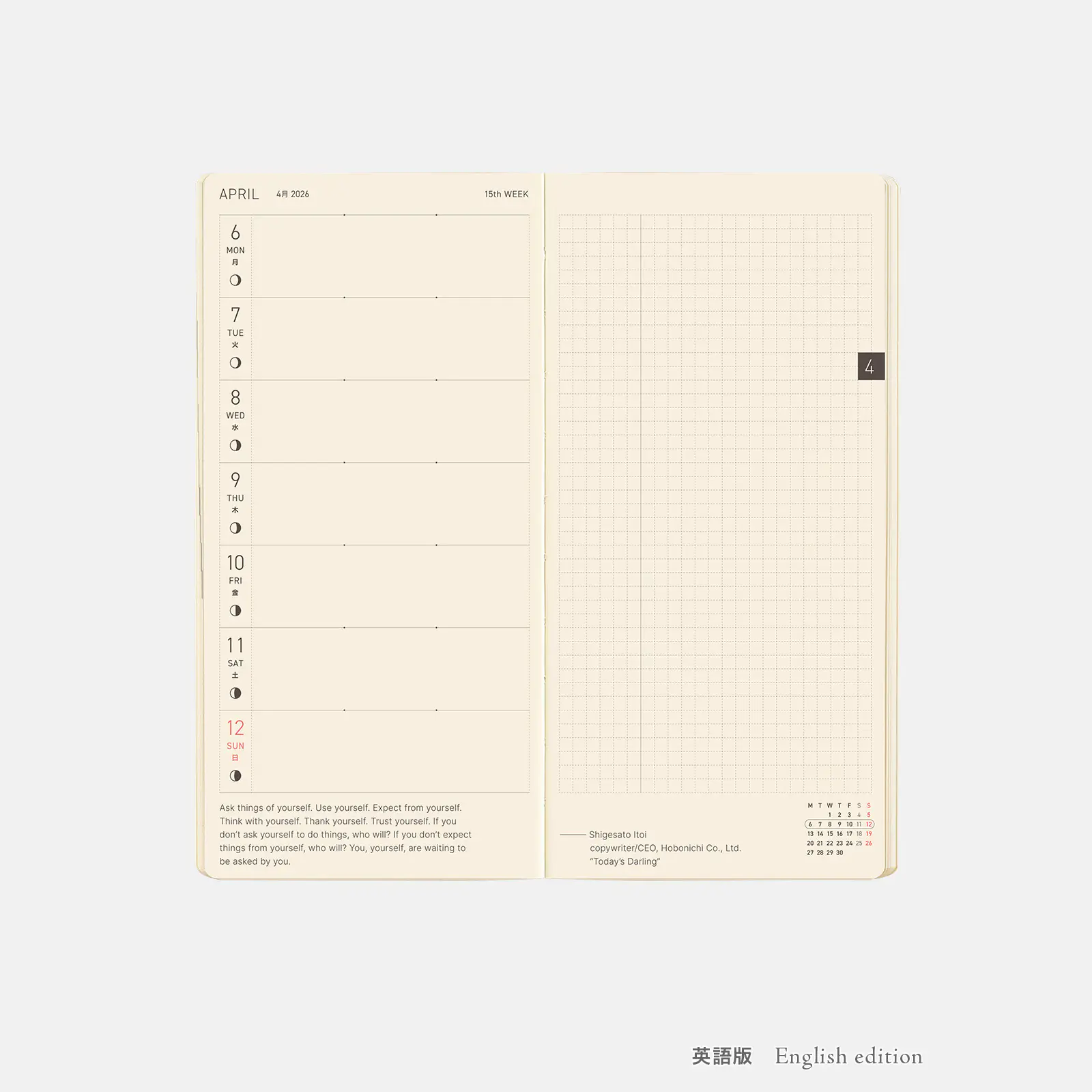 記載される内容週番号/六曜(大安、仏滅など)/二十四節気(立春、春分、夏至など)/祝日、記念日など(聖バレンタインデー、ひな祭り、母の日、父の日など)/月の満ち欠け(週間ページ全てに記載・月間カレンダーに満月と新月のみ記載)