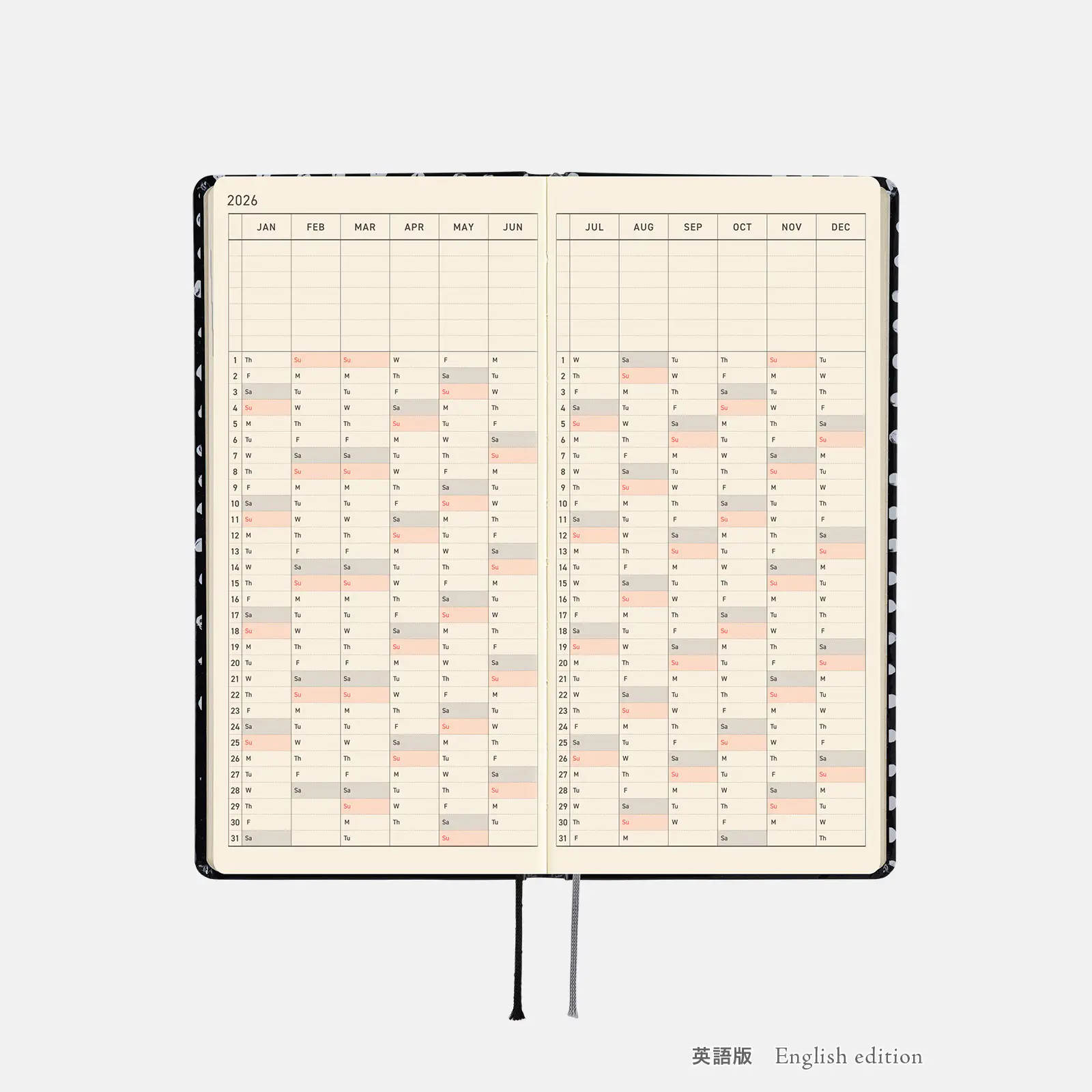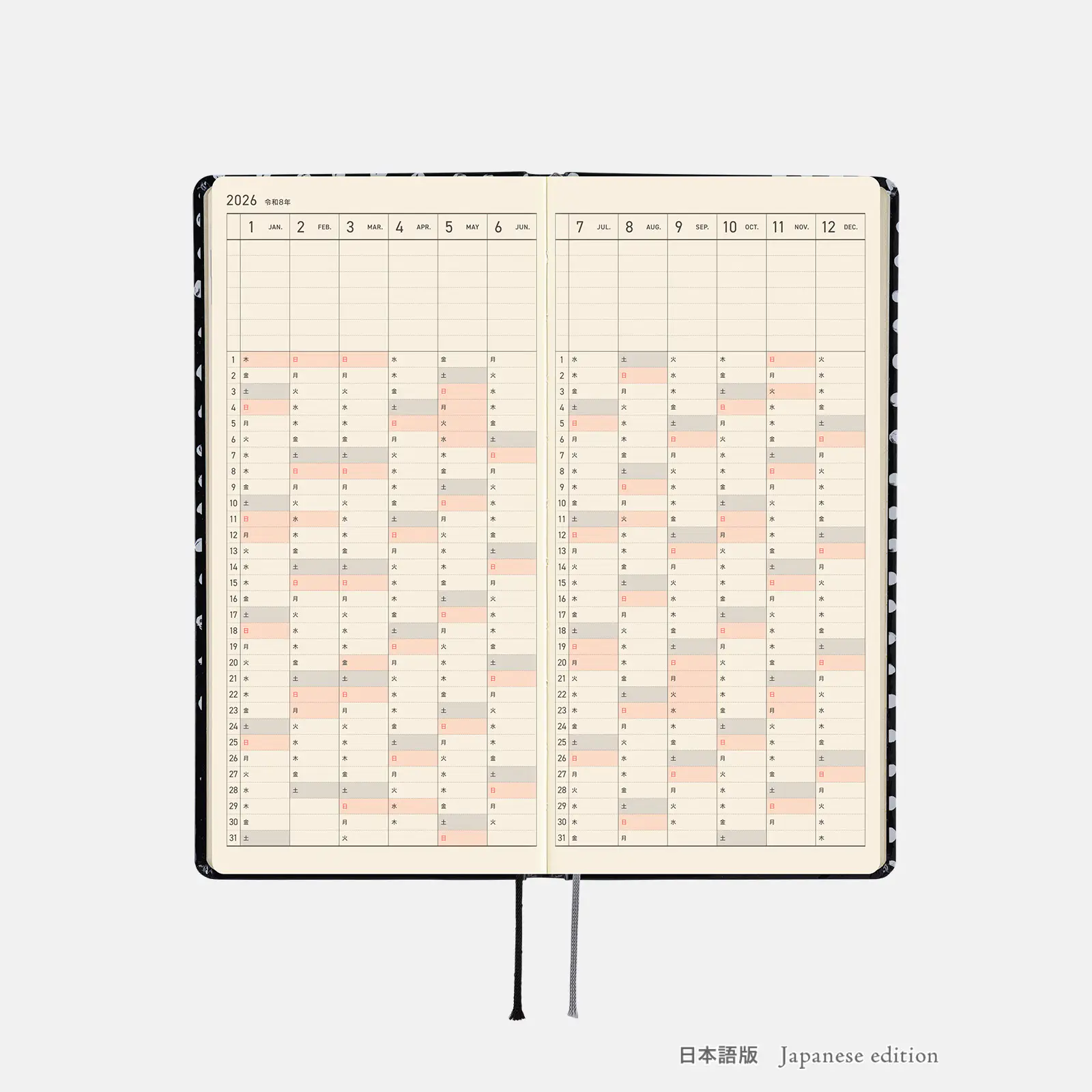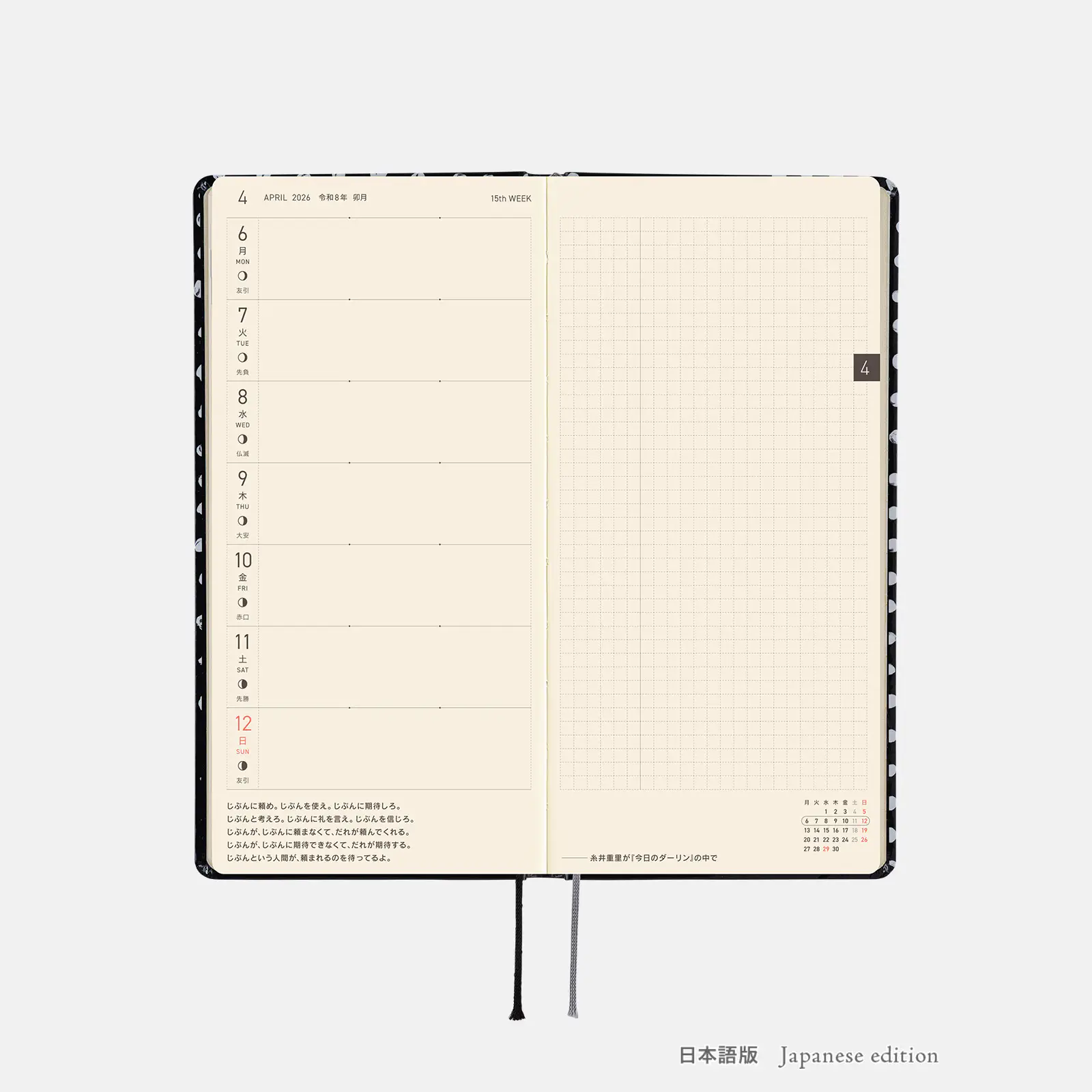 記載される内容週番号/六曜(大安、仏滅など)/二十四節気(立春、春分、夏至など)/祝日、記念日など(聖バレンタインデー、ひな祭り、母の日、父の日など)/月の満ち欠け(週間ページ全てに記載・月間カレンダーに満月と新月のみ記載)