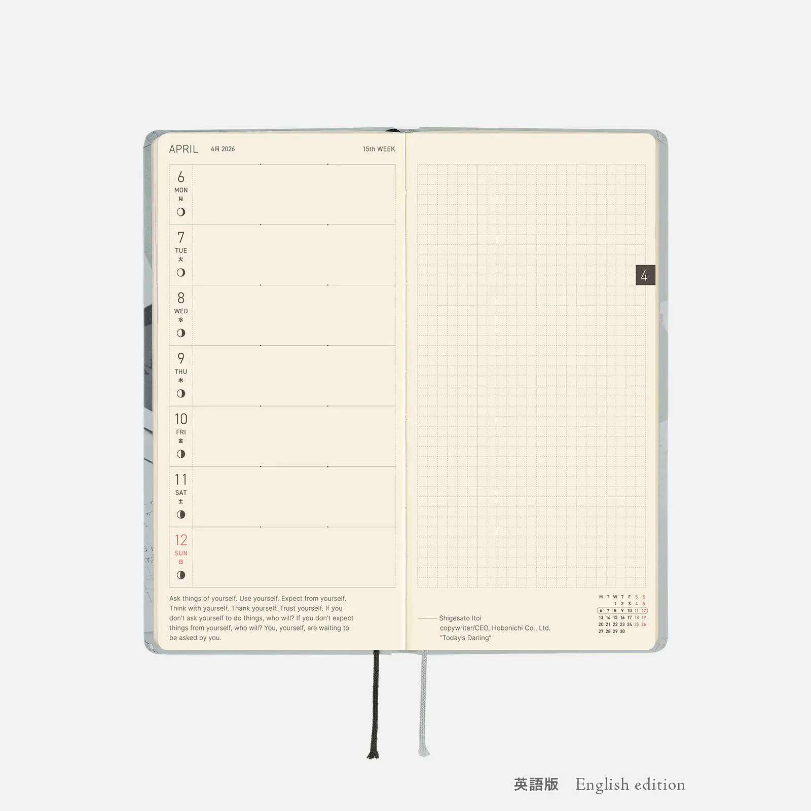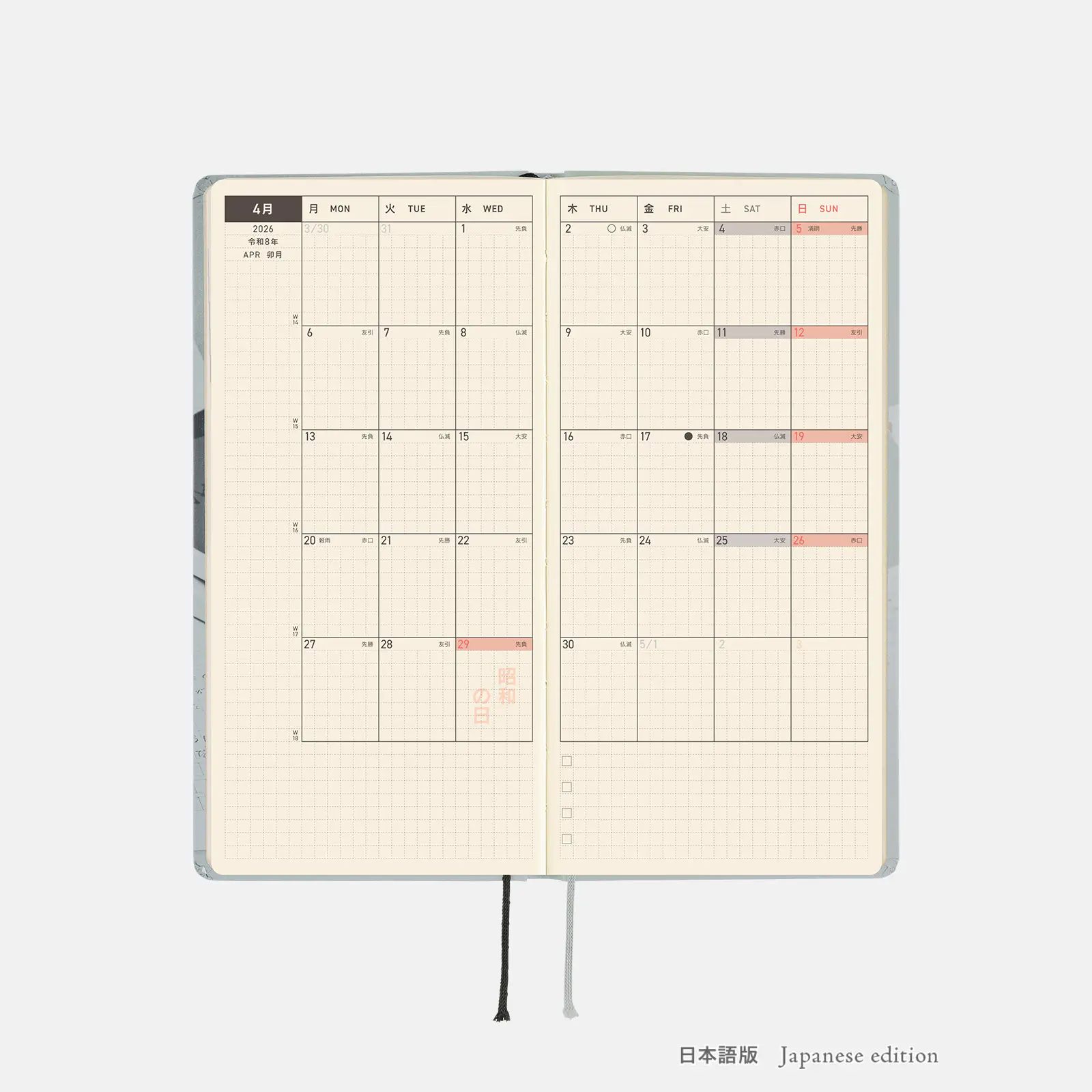 | 記載される内容 | 週番号/六曜(大安、仏滅など)/二十四節気(立春、春分、夏至など)/祝日、記念日など(聖バレンタインデー、ひな祭り、母の日、父の日など)/月の満ち欠け(週間ページ全てに記載・月間カレンダーに満月と新月のみ記載) |