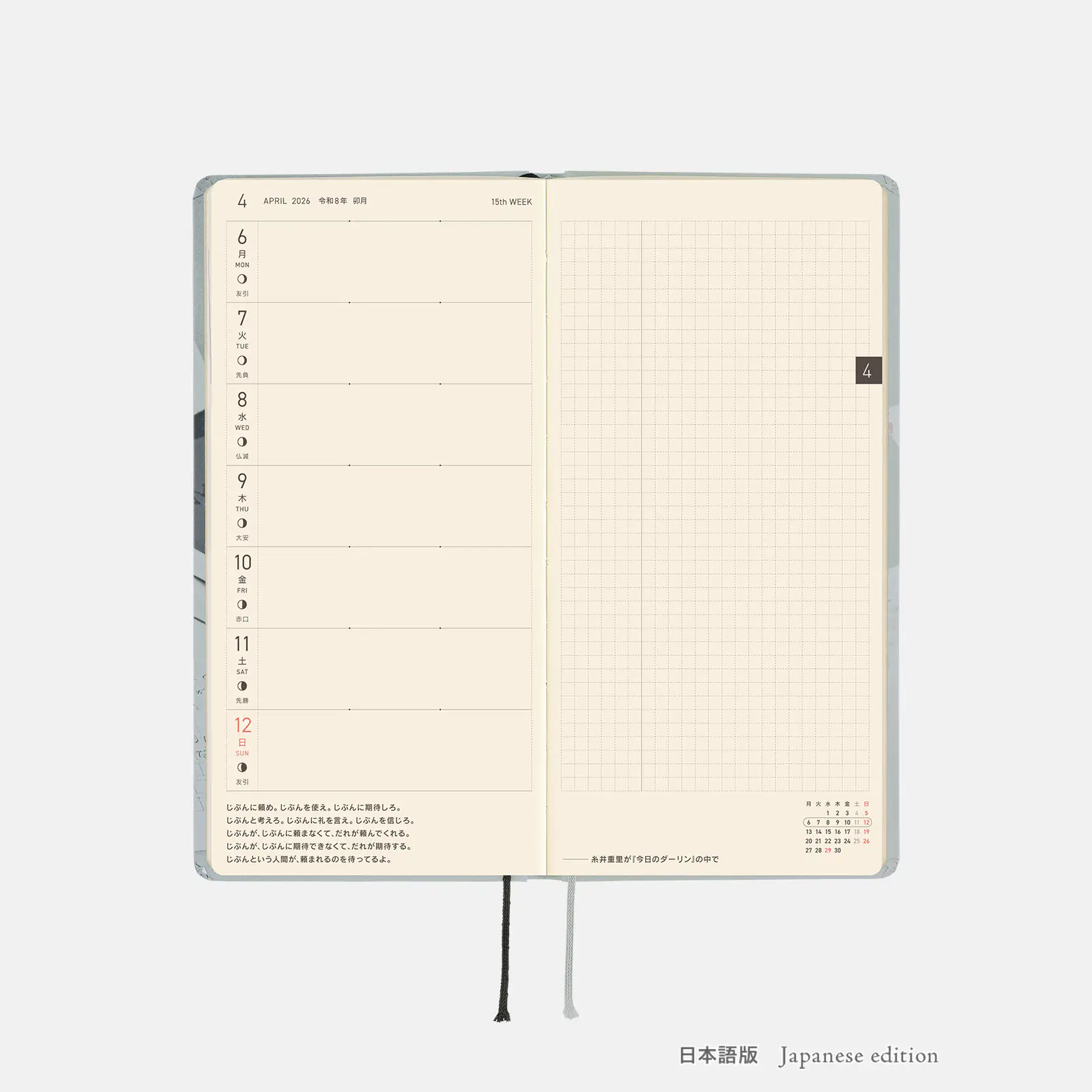 | 記載される内容 | 週番号/月の満ち欠け(週間ページ全てに記載・月間カレンダーに満月と新月のみ記載) ※祝日の記載はありません。 |