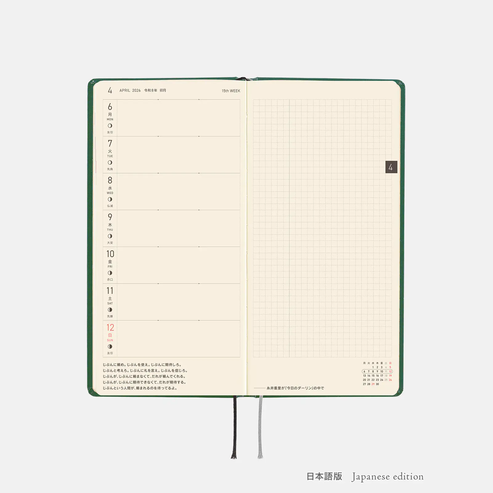 | 記載される内容 | 週番号/月の満ち欠け(週間ページ全てに記載・月間カレンダーに満月と新月のみ記載) ※祝日の記載はありません。 |