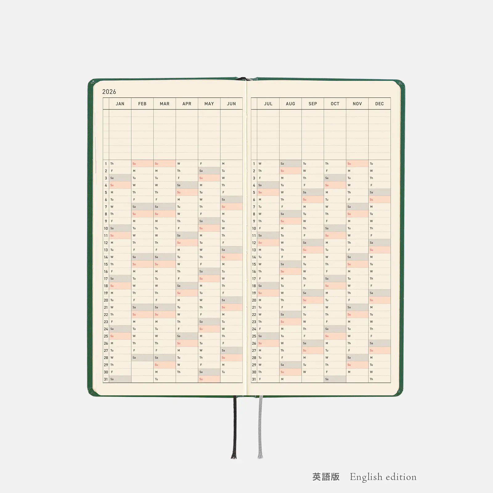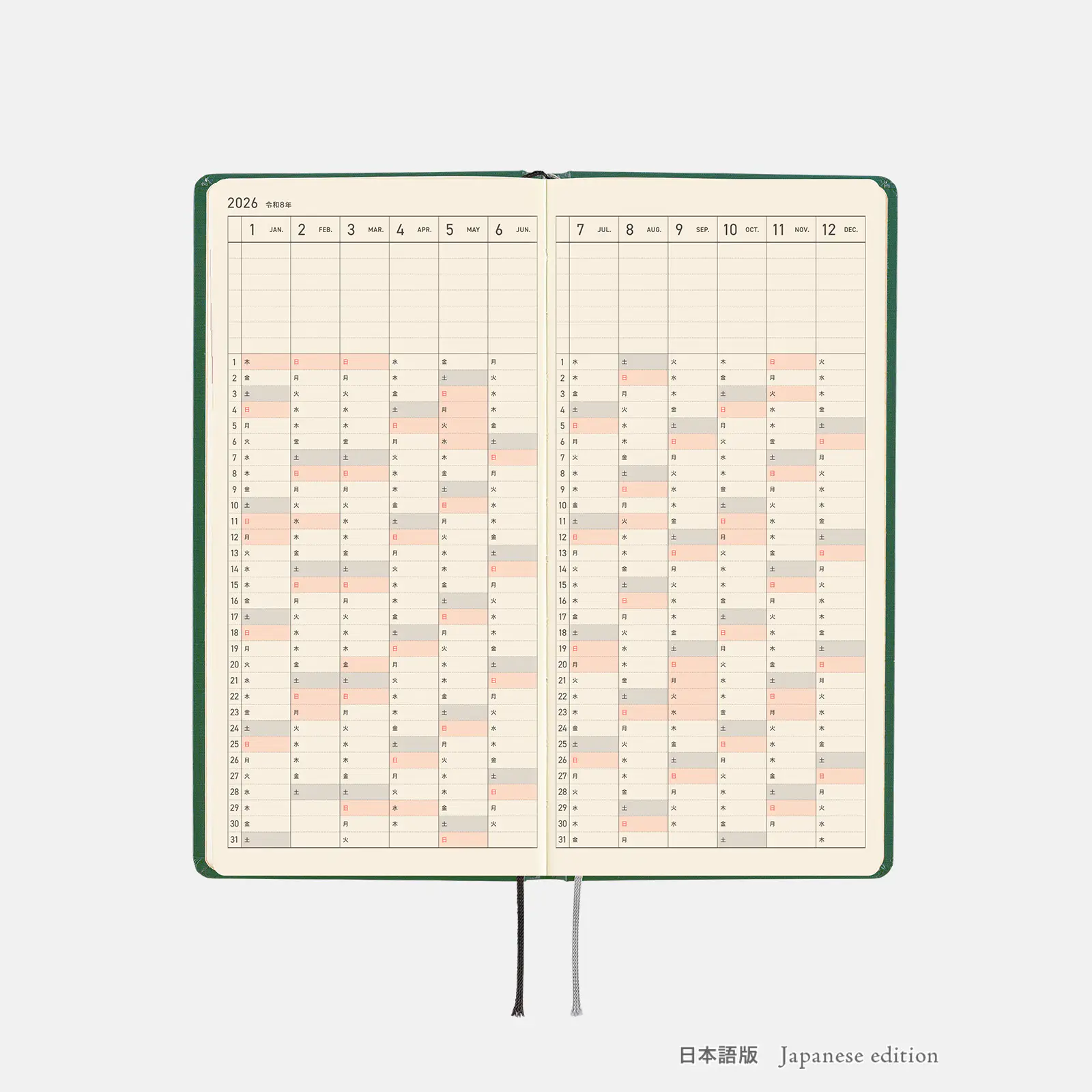 | 紙質・製本 | 薄くて軽く、なめらかな書き心地のトモエリバー(手帳専用紙)/糸かがり製本 |
