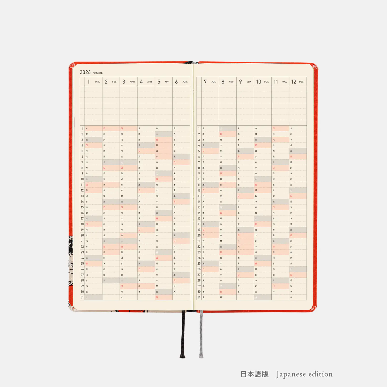 | 記載される内容 | 週番号/六曜(大安、仏滅など)/二十四節気(立春、春分、夏至など)/祝日、記念日など(聖バレンタインデー、ひな祭り、母の日、父の日など)/月の満ち欠け(週間ページ全てに記載・月間カレンダーに満月と新月のみ記載) |