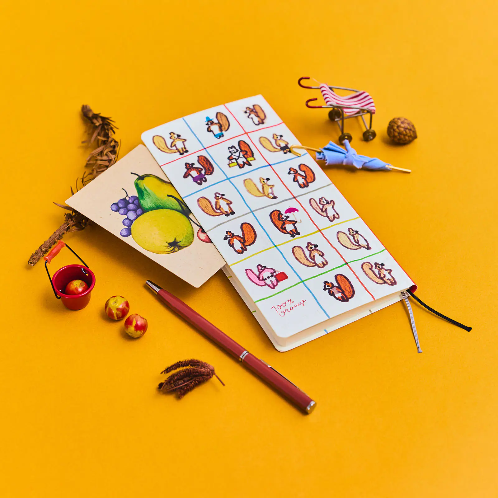 帽子をかぶっていたり、りんごや傘を持っていたりと、
