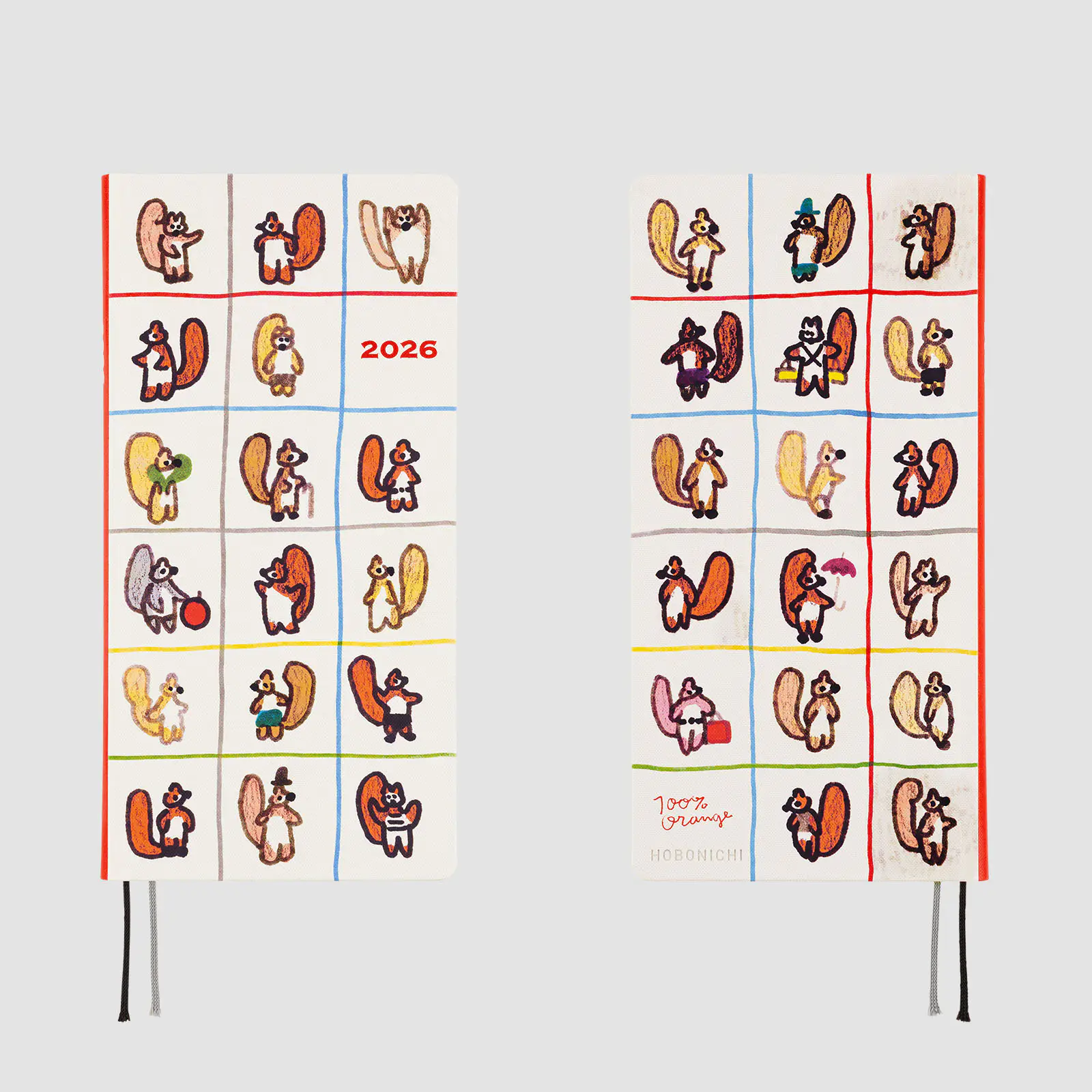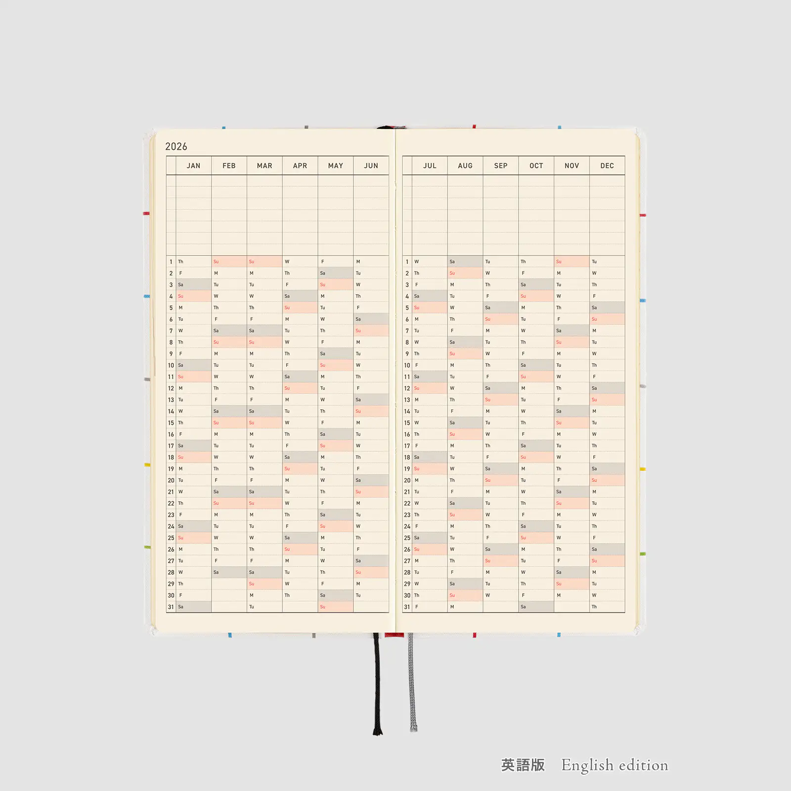 背表紙は赤で、「2026」の箔押しは白です。