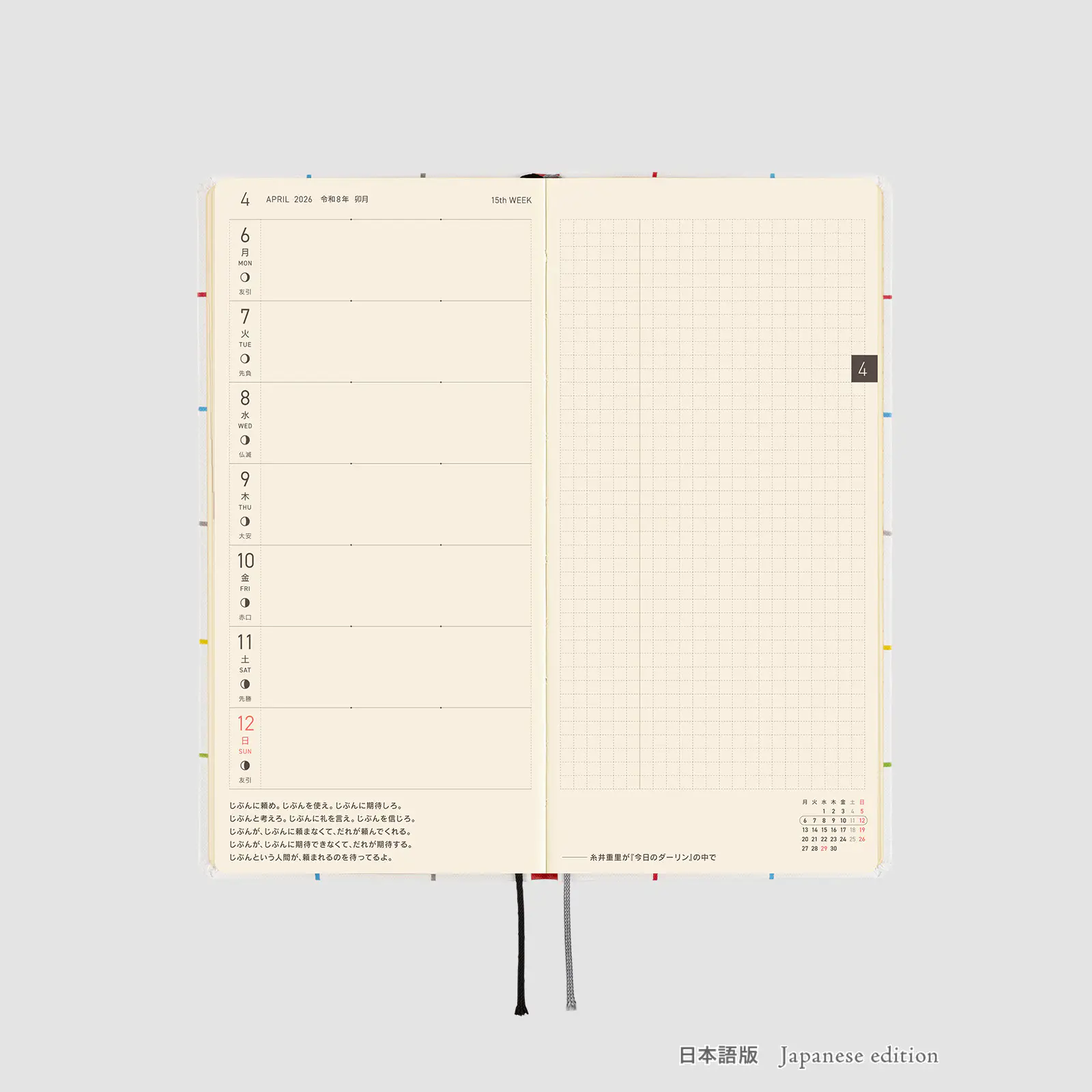 | 紙質・製本 | 薄くて軽く、なめらかな書き心地のトモエリバー(手帳専用紙)/糸かがり製本 |