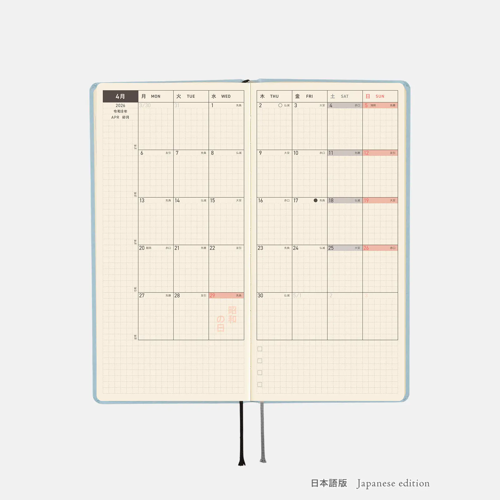 | 紙質・製本 | 薄くて軽く、なめらかな書き心地のトモエリバー(手帳専用紙)/糸かがり製本 |