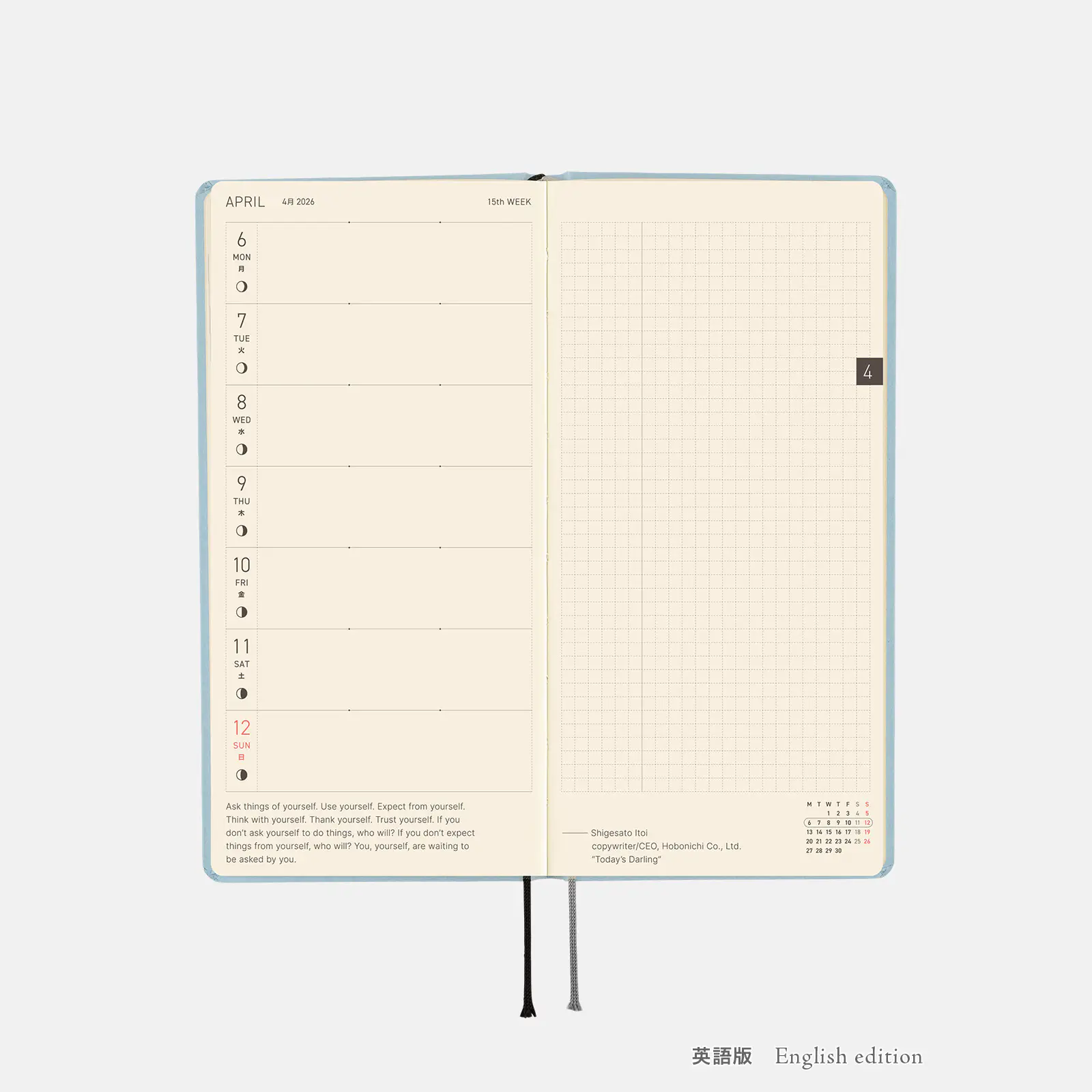 | 記載される内容 | 週番号/月の満ち欠け(週間ページ全てに記載・月間カレンダーに満月と新月のみ記載) ※祝日の記載はありません。 |