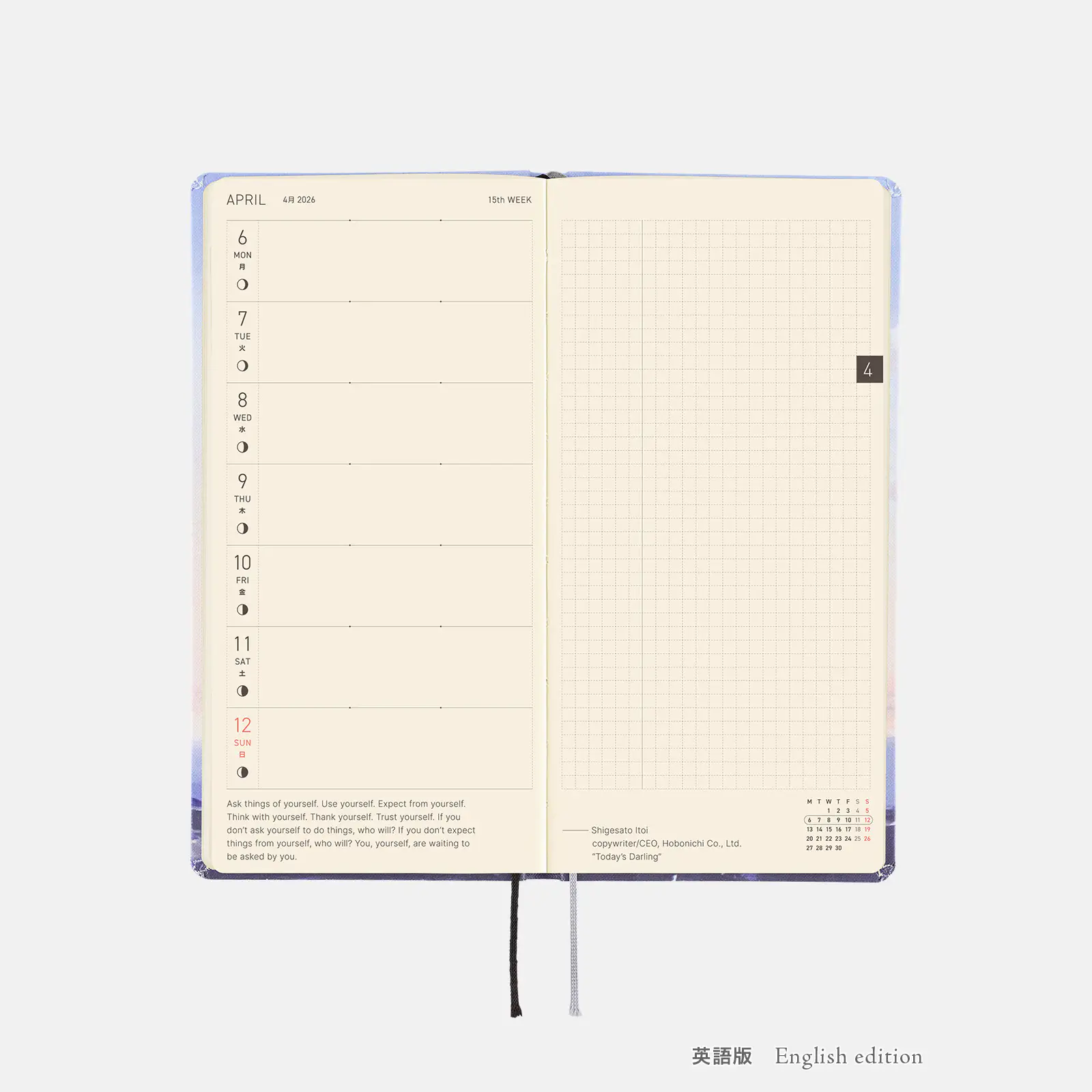 | 記載される内容 | 週番号/六曜(大安、仏滅など)/二十四節気(立春、春分、夏至など)/祝日、記念日など(聖バレンタインデー、ひな祭り、母の日、父の日など)/月の満ち欠け(週間ページ全てに記載・月間カレンダーに満月と新月のみ記載) |