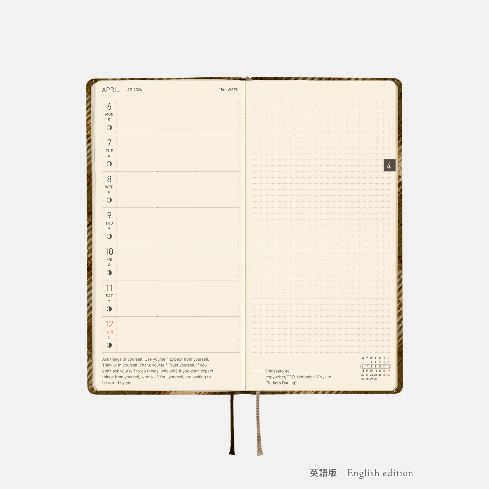 | 記載される内容 | 週番号/月の満ち欠け(週間ページ全てに記載・月間カレンダーに満月と新月のみ記載) ※祝日の記載はありません。 |