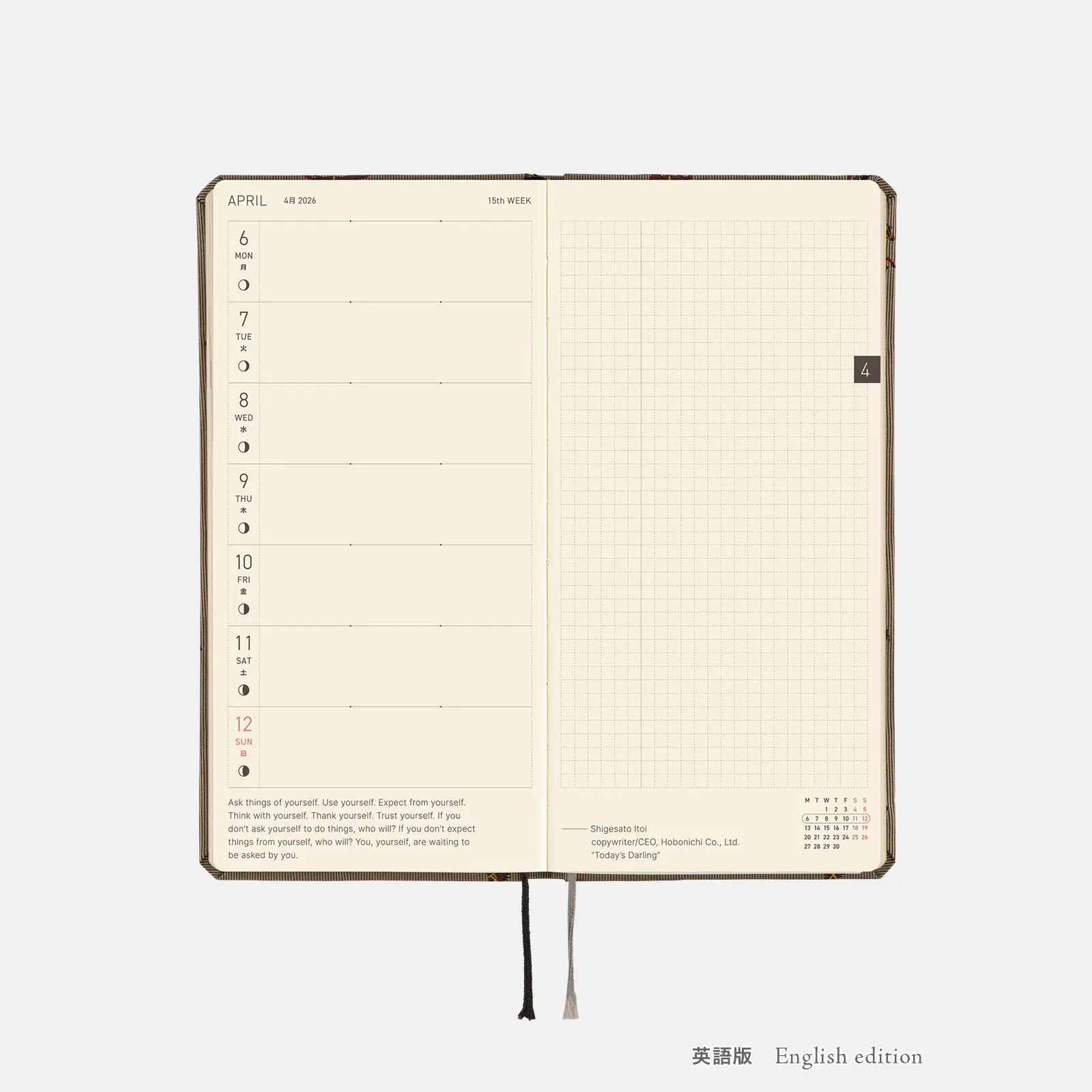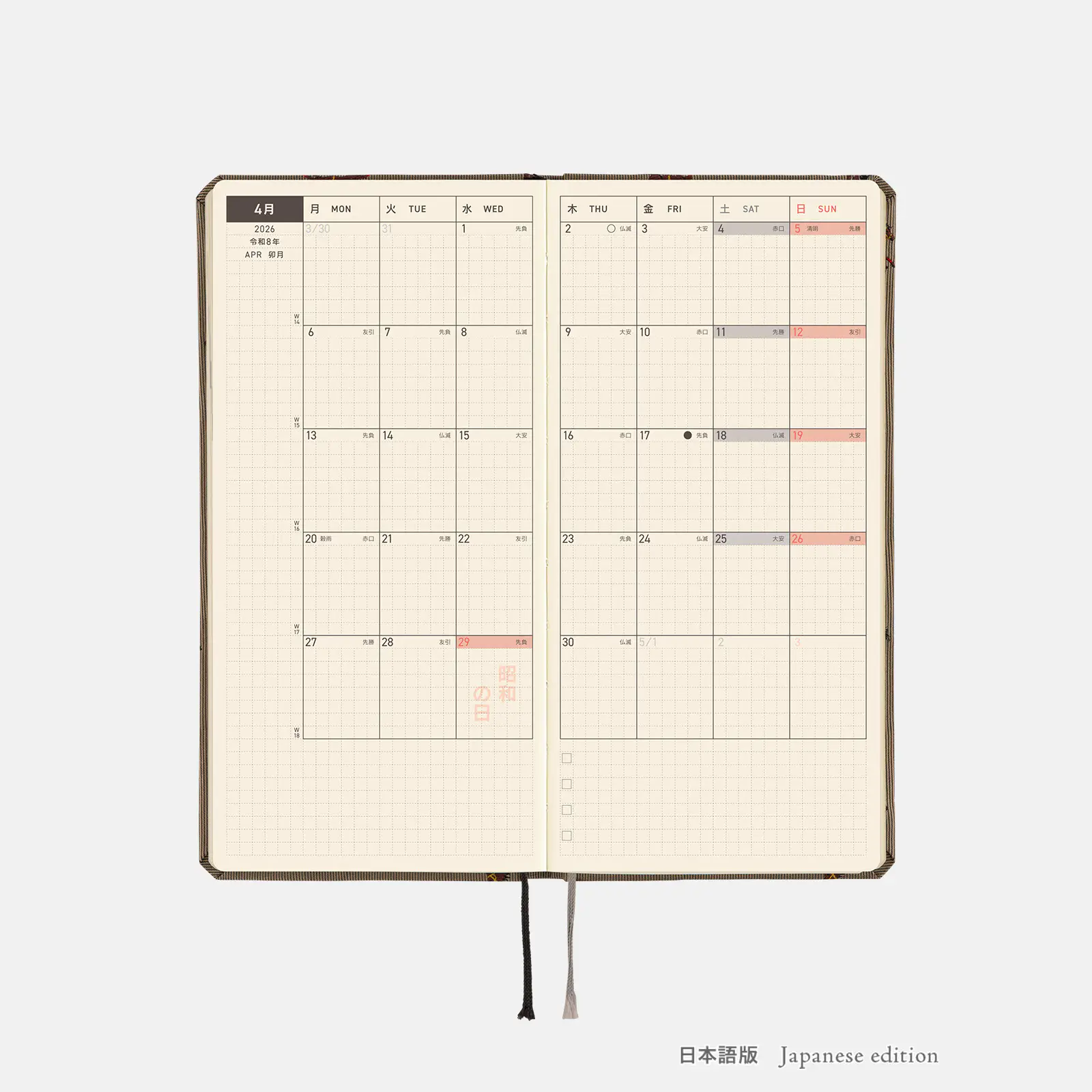 | 記載される内容 | 週番号/六曜(大安、仏滅など)/二十四節気(立春、春分、夏至など)/祝日、記念日など(聖バレンタインデー、ひな祭り、母の日、父の日など)/月の満ち欠け(週間ページ全てに記載・月間カレンダーに満月と新月のみ記載) |