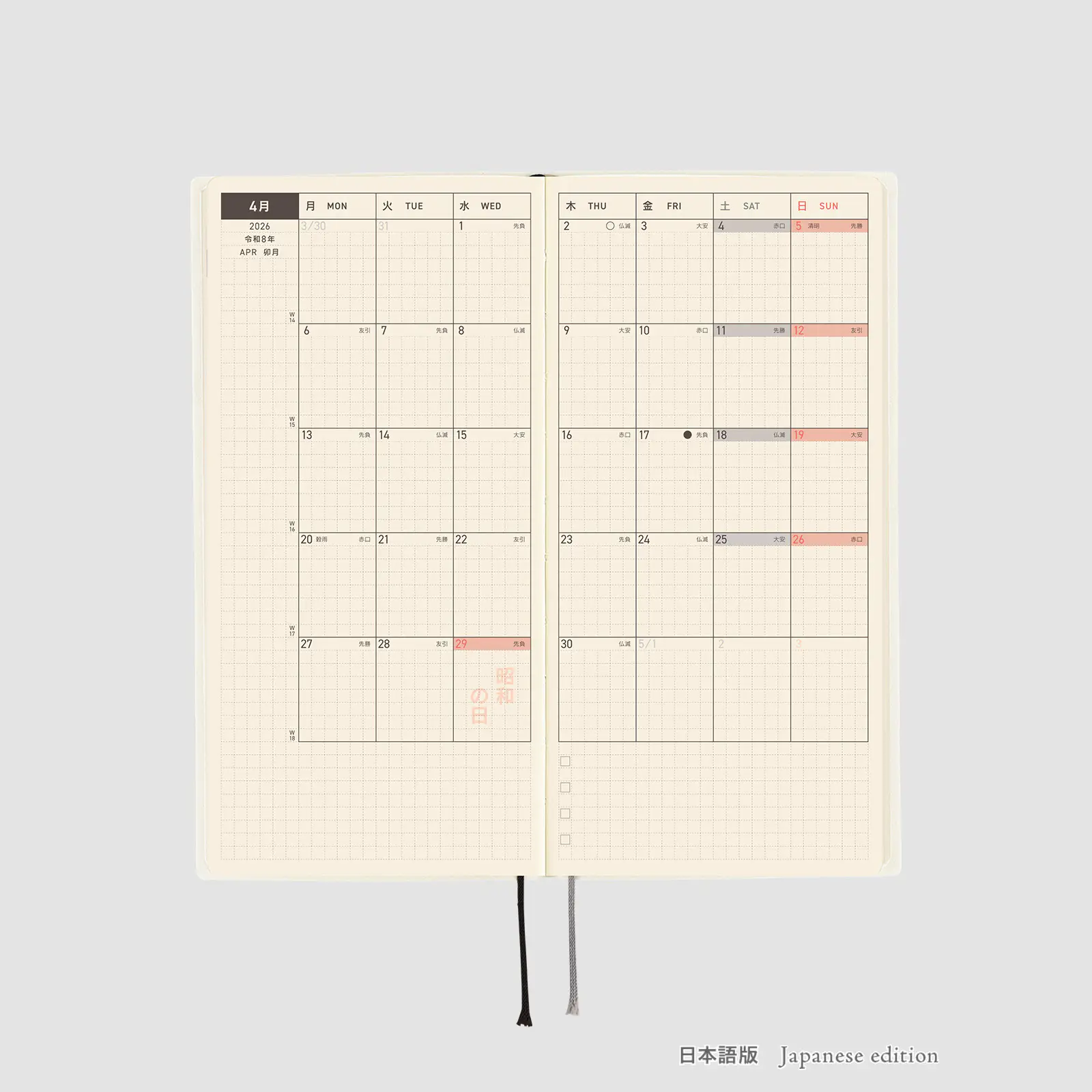 記載される内容週番号/六曜(大安、仏滅など)/二十四節気(立春、春分、夏至など)/祝日、記念日など(聖バレンタインデー、ひな祭り、母の日、父の日など)/月の満ち欠け(週間ページ全てに記載・月間カレンダーに満月と新月のみ記載)
