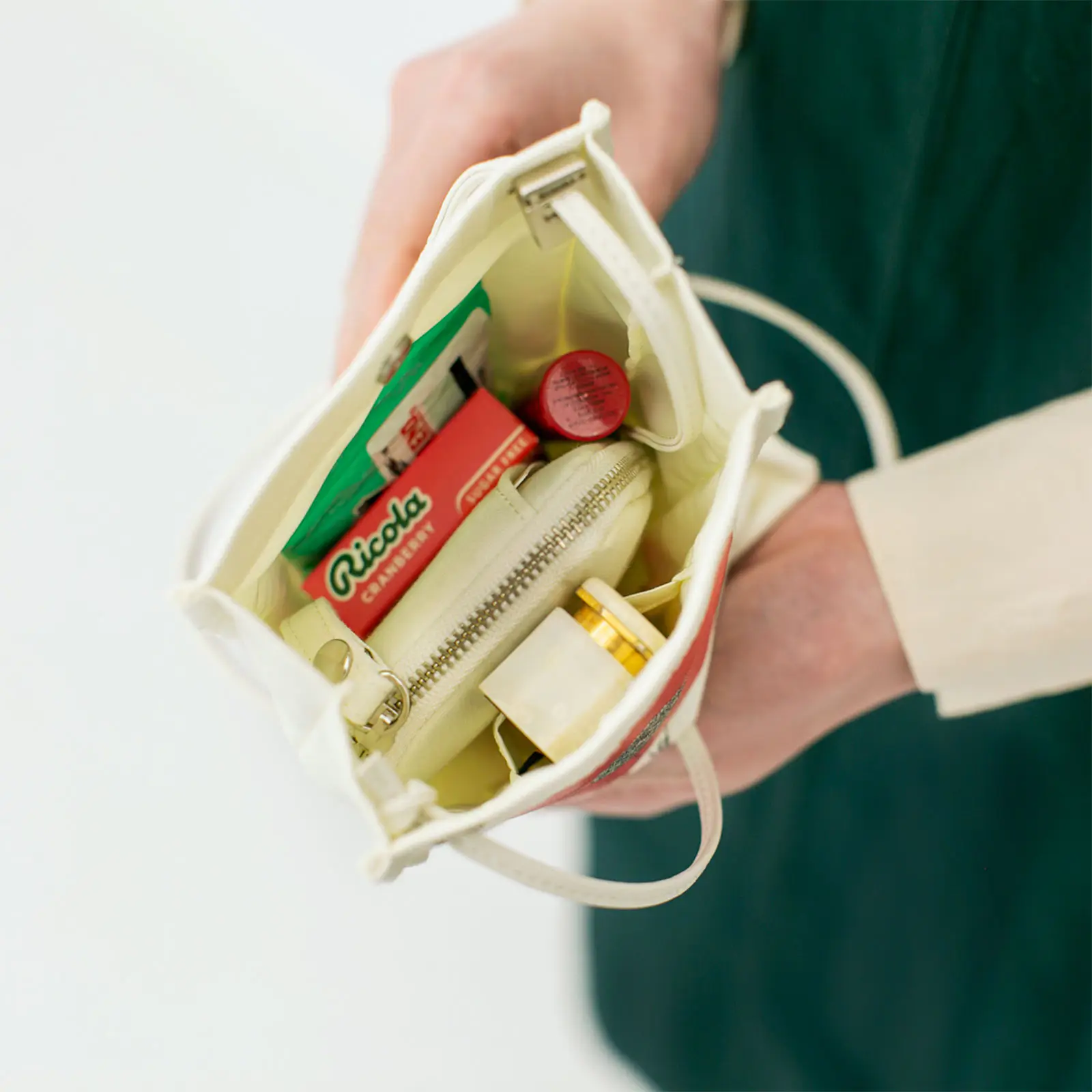 旅先のホテル周辺でぶらつきたいときや、朝食をとりにいくときに。部屋のカギ、財布、ハンカチ、文庫本など、必要なものだけを持ち歩けます。