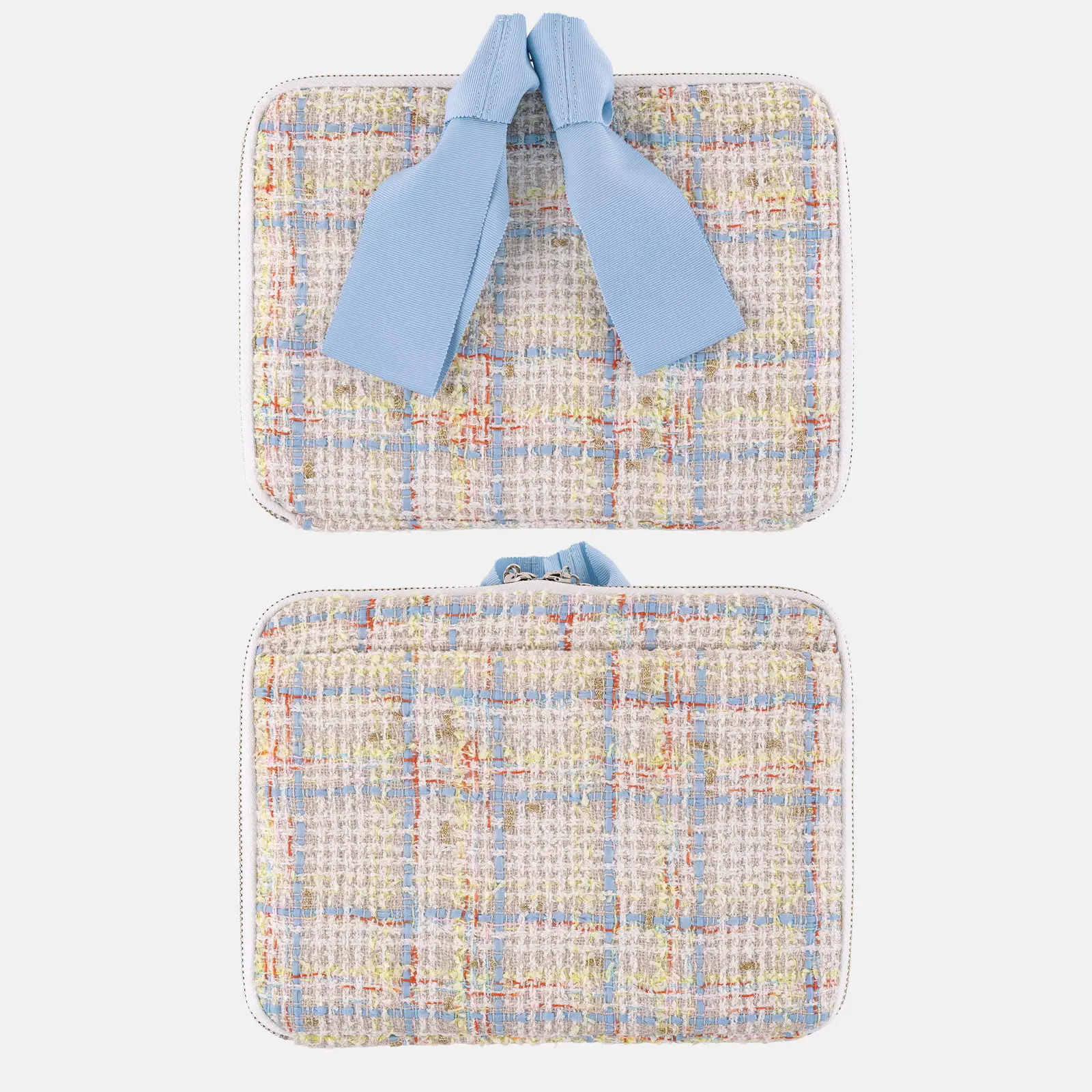 ホワイトの地をベースに、ライトブルー、イエロー、