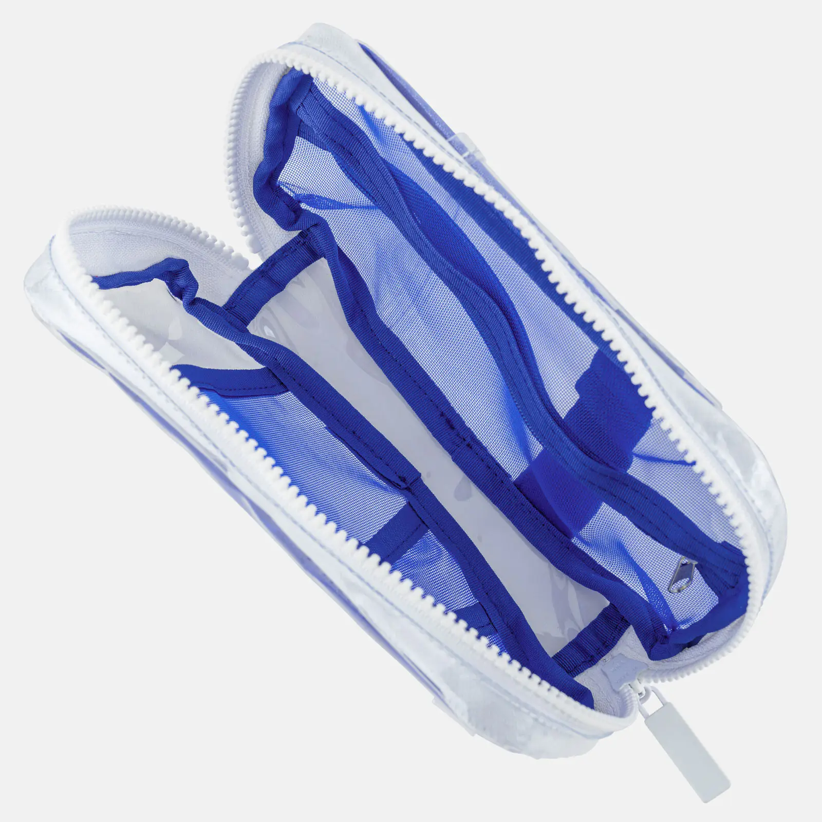 ビビッドな青とファスナー部分の白を組み合わせ、