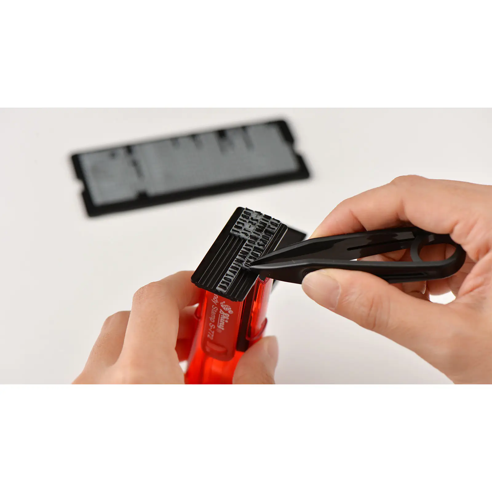 スタンプ本体、アルファベットの活字、ピンセット、