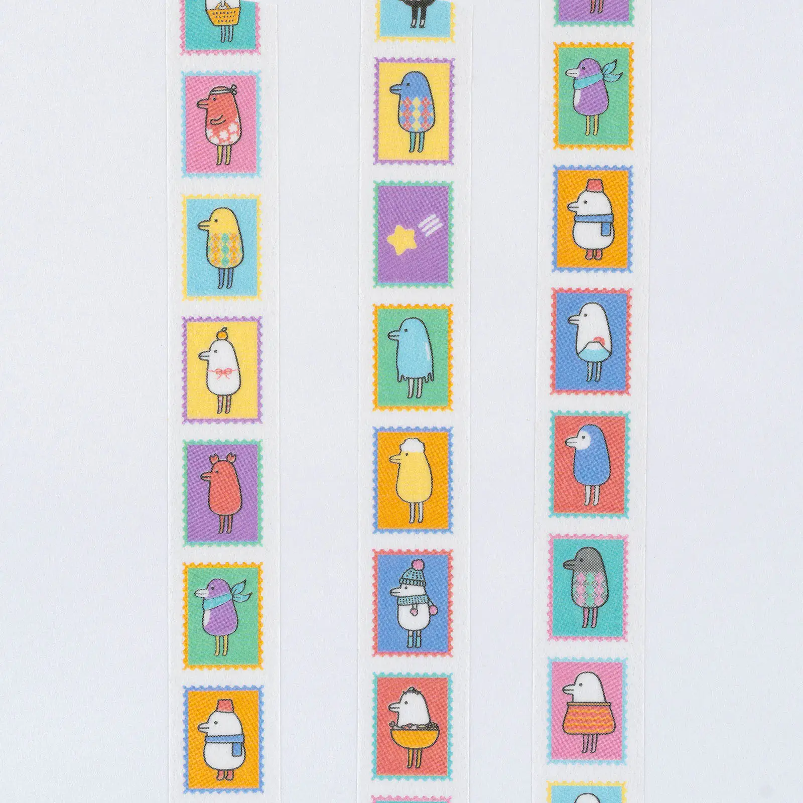 いろんな姿のほぼトリドリが並ぶ切手のようなデザイン。