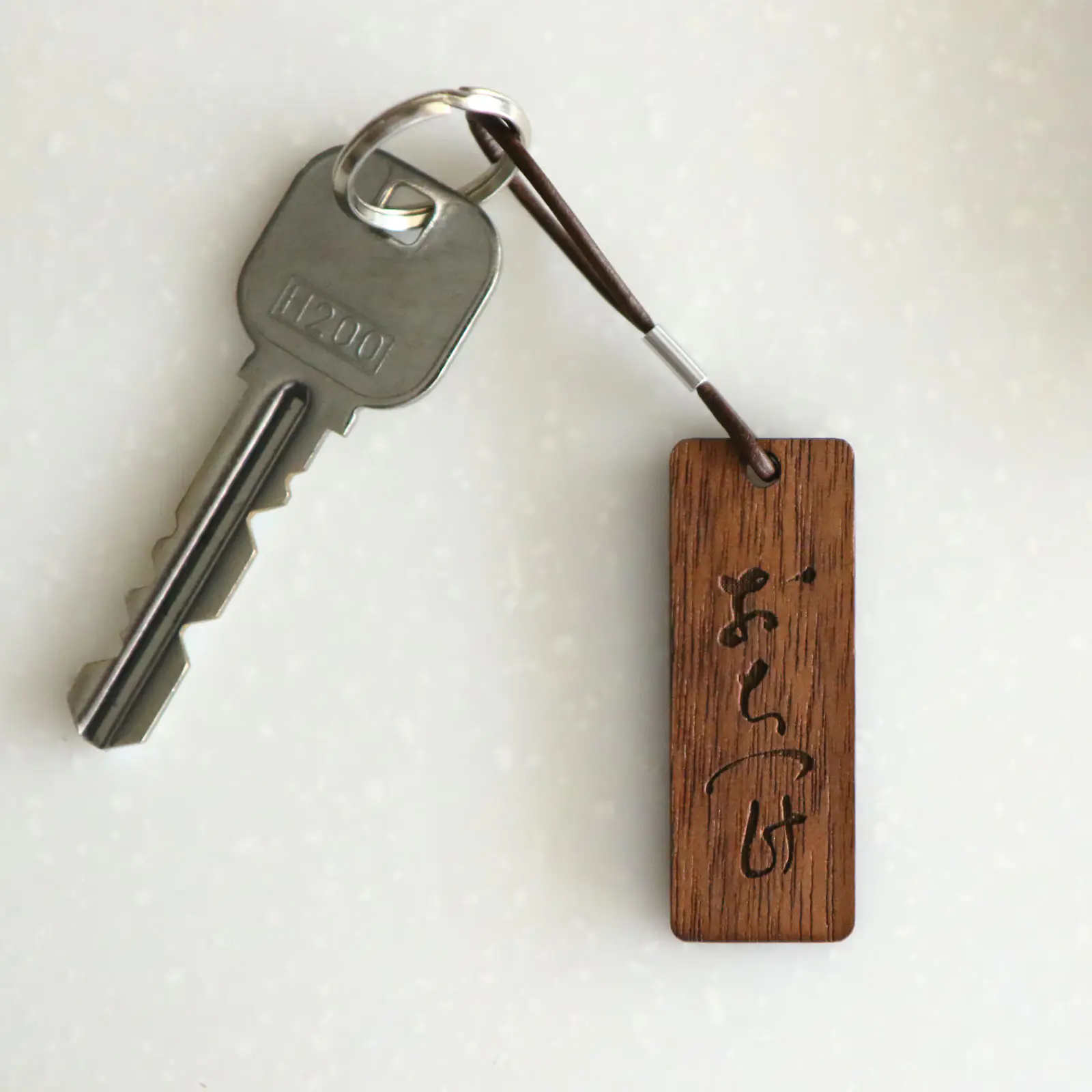 ウォールナット材で作られたキーホルダーに、