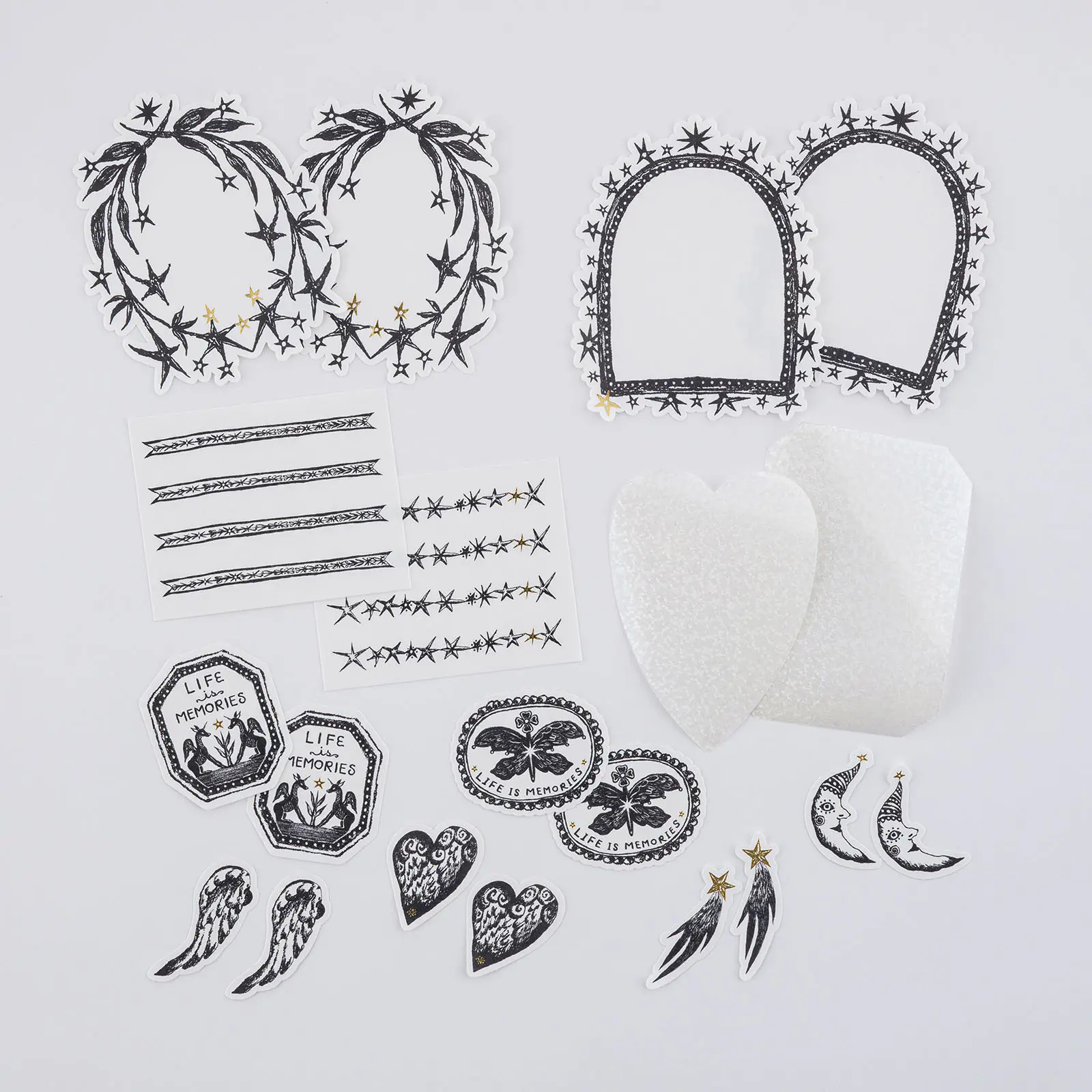 | セット内容 | 26枚入り フレームシール(2種×各2枚) ラインシール(2種×各4枚) モチーフシール(6種×各2枚) キラキラホログラムシール(2型×各1枚) |