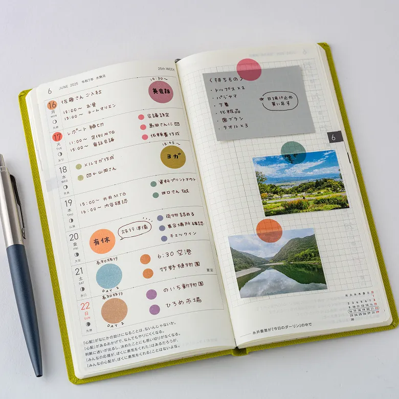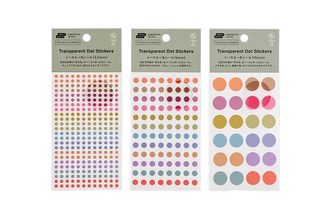 ハリのあるフィルム素材でつくった透明な丸いシール。ほぼ日手帳の方眼に気持ちよくおさまる大きさの3サイズがあります。