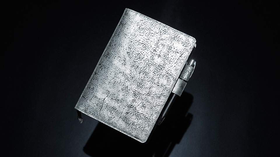 シルバーの箔づけをほどこしたイタリアの革、