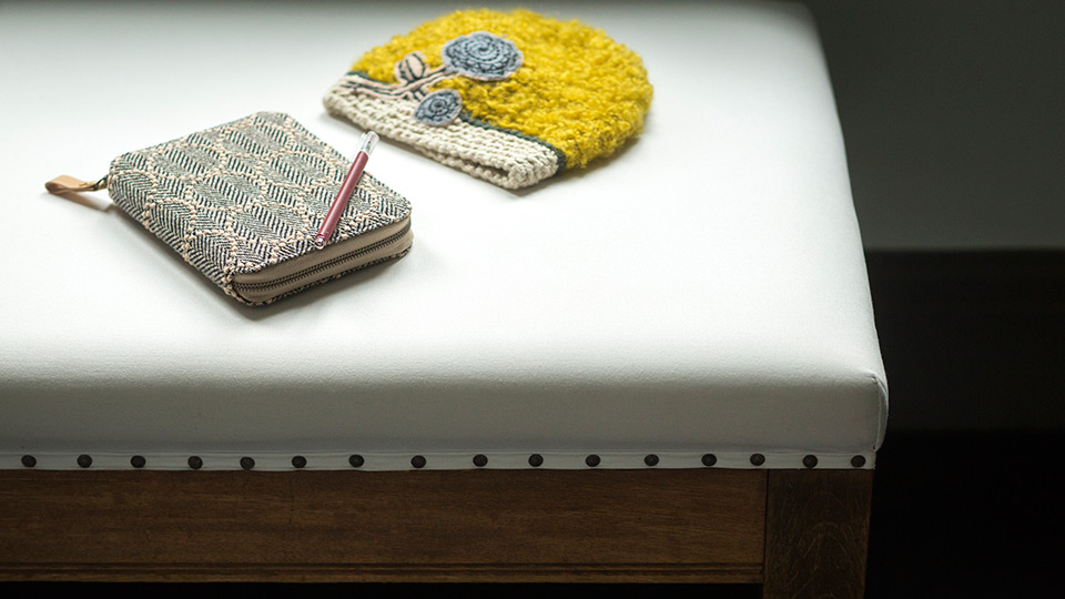 刺繍をほどこしたテキスタイルのカバーとなりました。