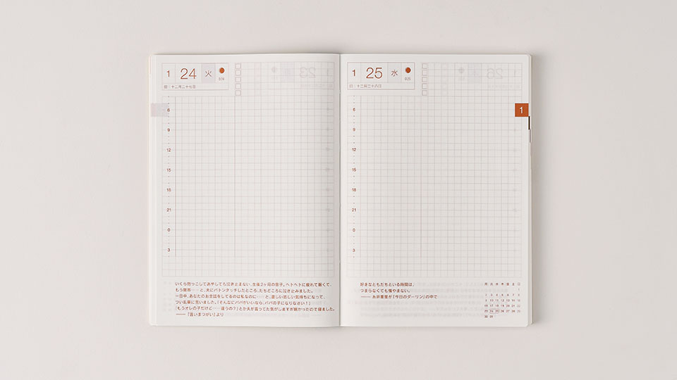 - 日番号/週番号(月間カレンダーに記載)/旧暦の表記/六曜(大安、仏滅など)(月間カレンダーに記載)/二十四節気(立春、春分、夏至など)、雑節/祝日、記念日など(バレンタインデー、ひなまつり、母の日、父の日など)/月の満ち欠け(1日ページ全ページに記載、月間カレンダーに満月と新月のみ記載)