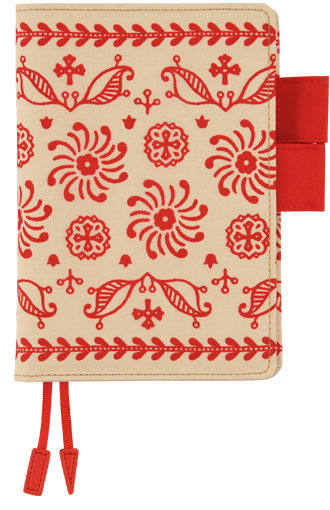 グラフィックデザイナーの佐藤卓さんの アートディレクションのもと、 デザイナーの日下部昌子さんが いちからパターンをおこした オリジナル柄の大人気プリントカバー、 「世界の伝統柄シリーズ」。 2012は、インドの伝統柄の登場です。 少し黄色が入った白い地に、 なんともいえないエスニックな印象を持つ 独特の赤い色で花柄のパターンが描かれています。 バタフライストッパーや中面、しおりも 同じ赤い色を使っています。 手書きならではの線や形のゆらぎを どうぞ存分に味わってくださいね。