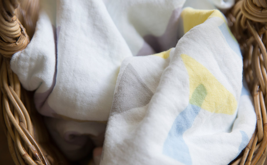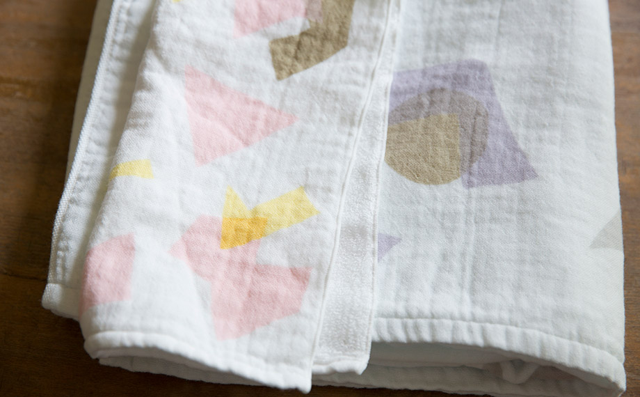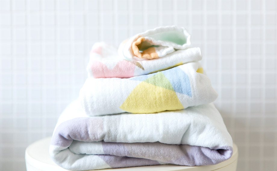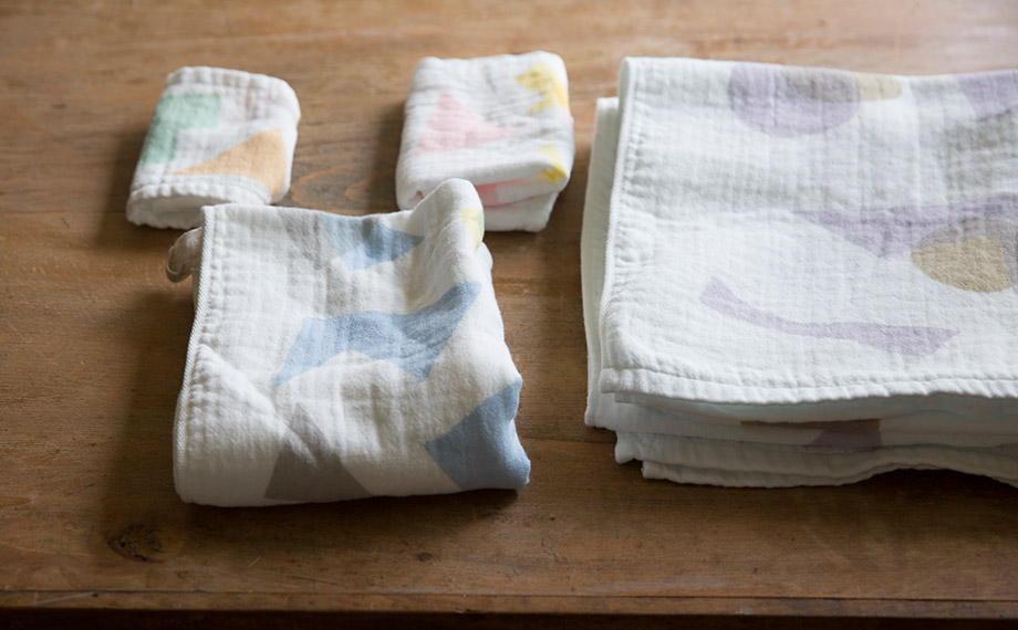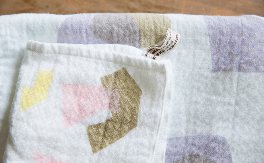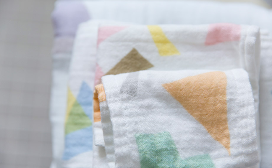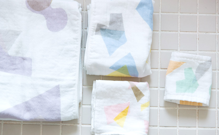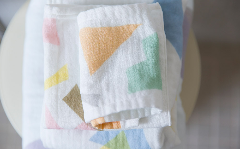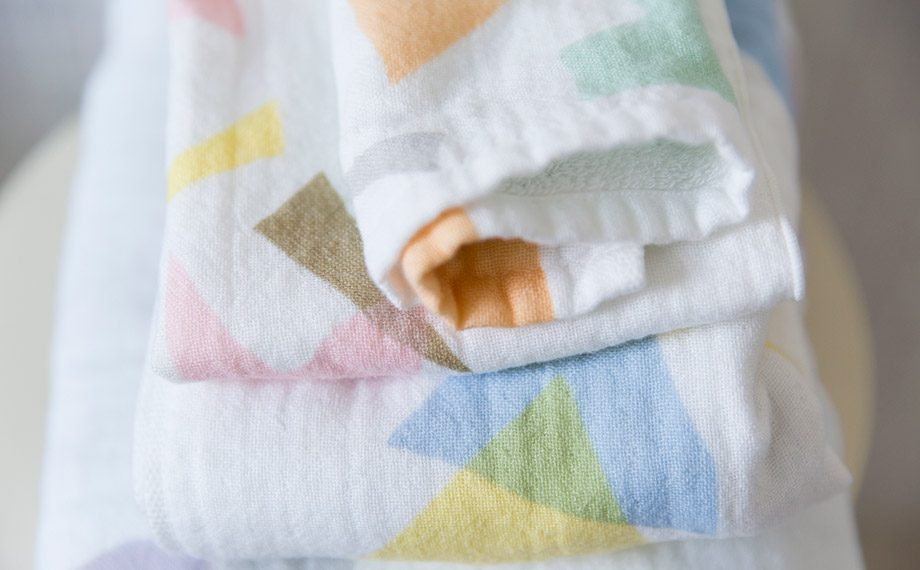 白いタオルいっぱいにちりばめたランダムな模様のプリントタオル。