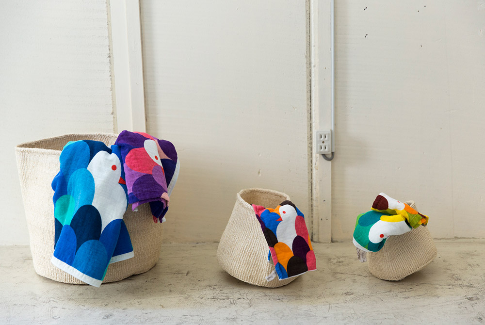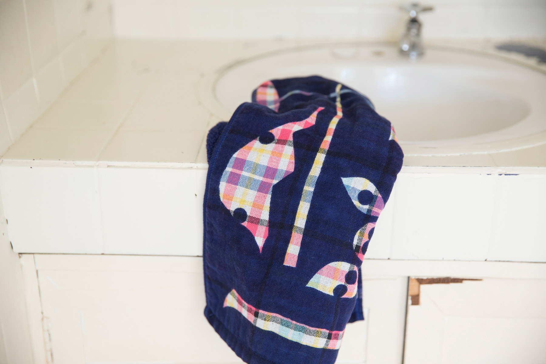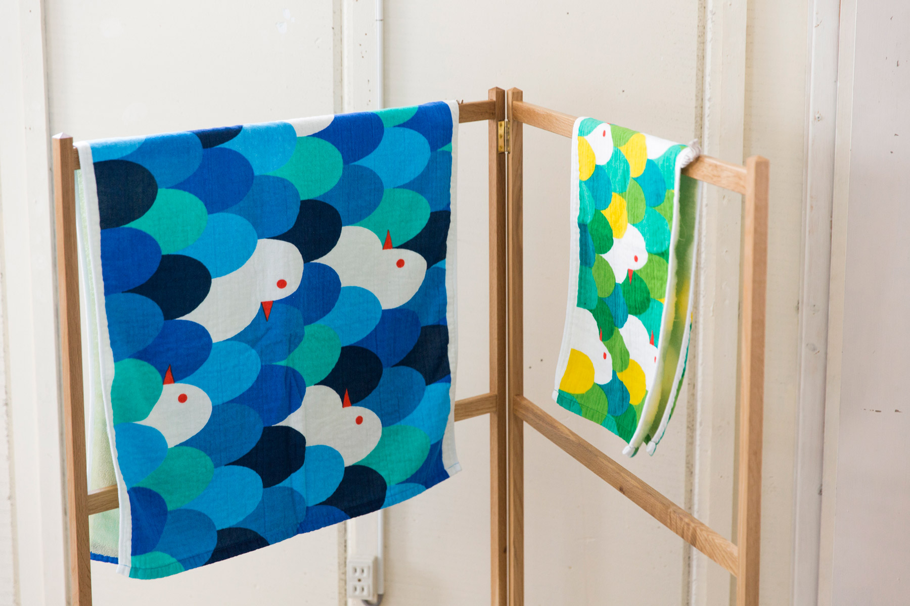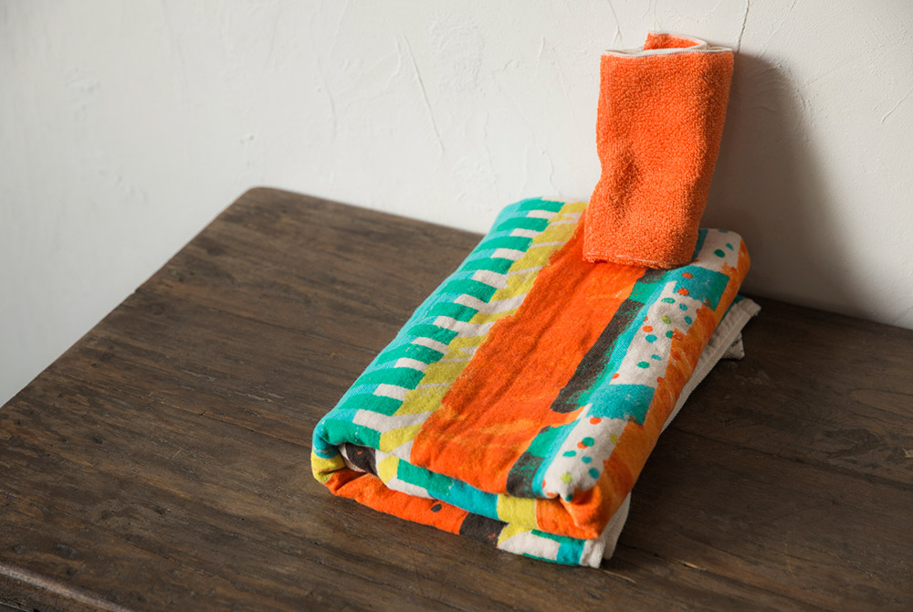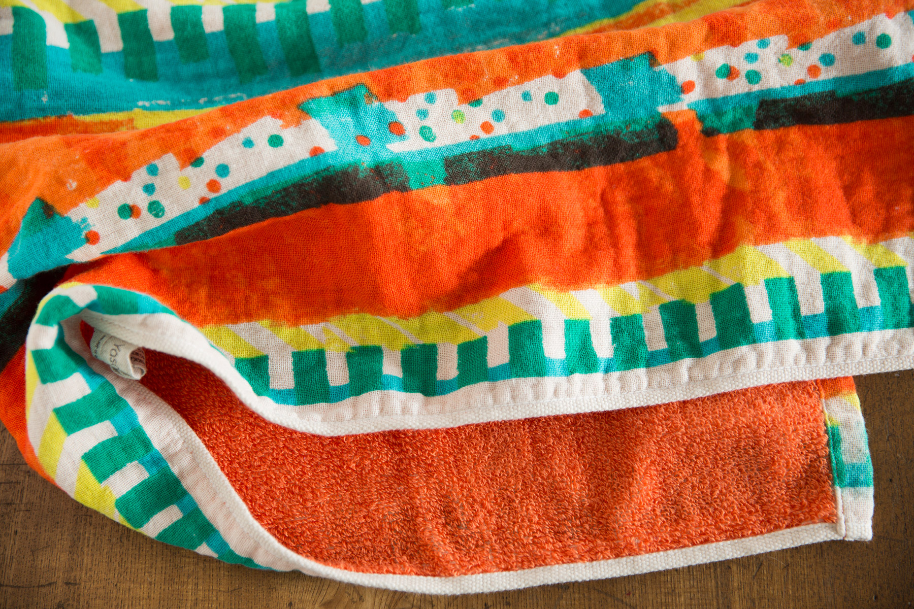 この、ビビッドな色づかいで、大胆なデザインのタオルは、