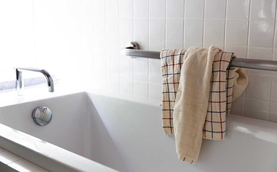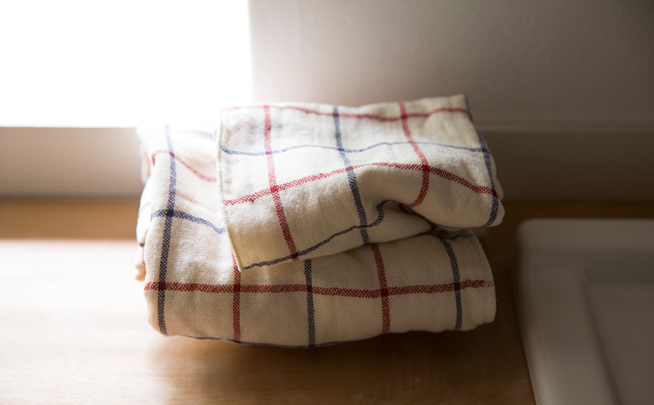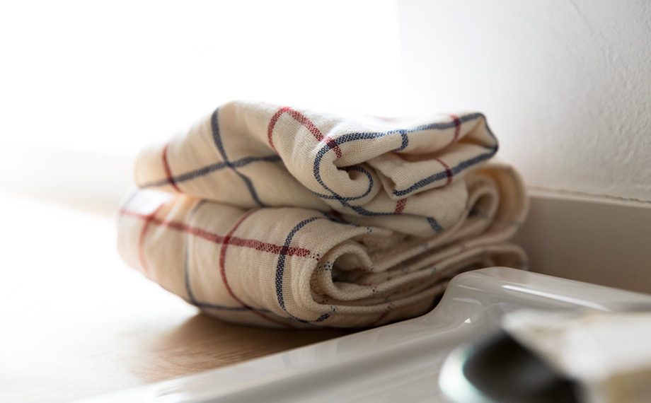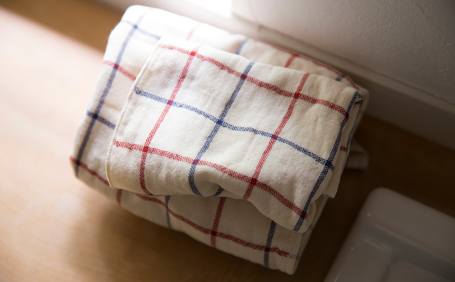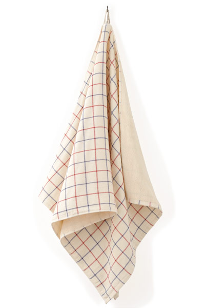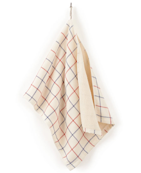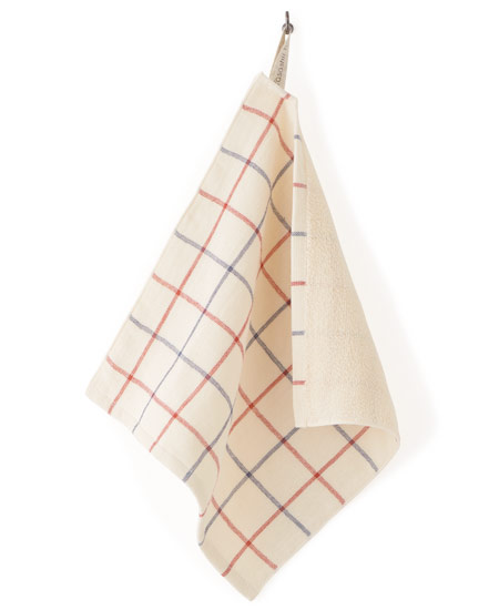 窓枠をモチーフにした イギリスの伝統的なチェック 「ウィンドウペーン」。 スーツの生地に使われたり、 北欧の椅子の張り地に使われたりする 歴史のある織り柄を、 ベージュ、ネイビー、臙脂の 3つの色(トリコロール)でタオルにしました。 キッチンにもよく似合いそうな すっきりとした色の組み合わせです。 ベージュがあたたかみのある色なので、 夏だけでなく、一年中お使いいただけますよ。
