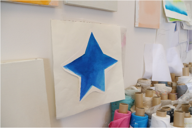 ▲ハンドの「美しい星<Hoku nani>」は、これまで伊藤さんの作品には登場したことがなかったモチーフである星が。青は地球の色、ピンクは人の心のなかにある祝福の気持ちや、ひらめきの瞬間を描いています。