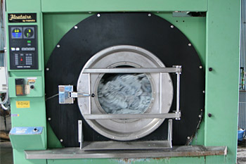 ▲巨大な洗濯機が並んでいるタオル専用の洗濯工場。