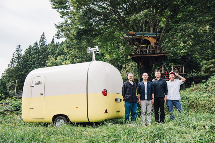 ▲左から糸井、ウェルビーの米田さんと和田さん、写真家の池田さん。落合にある東北ツリーハウス観光協会のツリーハウス「No.005 MERRY」の前で記念撮影!