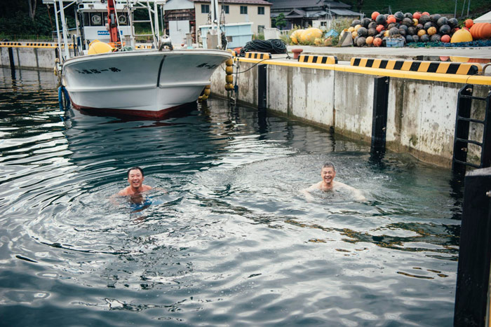 ▲9月末の海に浸かる池田さんと糸井。
