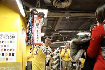 くす玉を準備していただきました。さぁ、見習い店員の接客開始です!