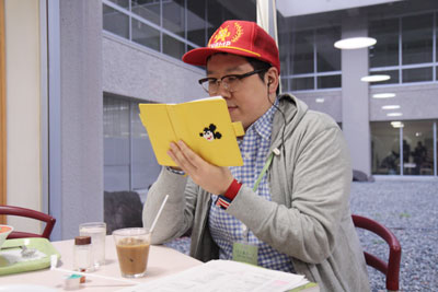 ▲なにやら資料に目をとおしていると思いきや、進行台本ですね。